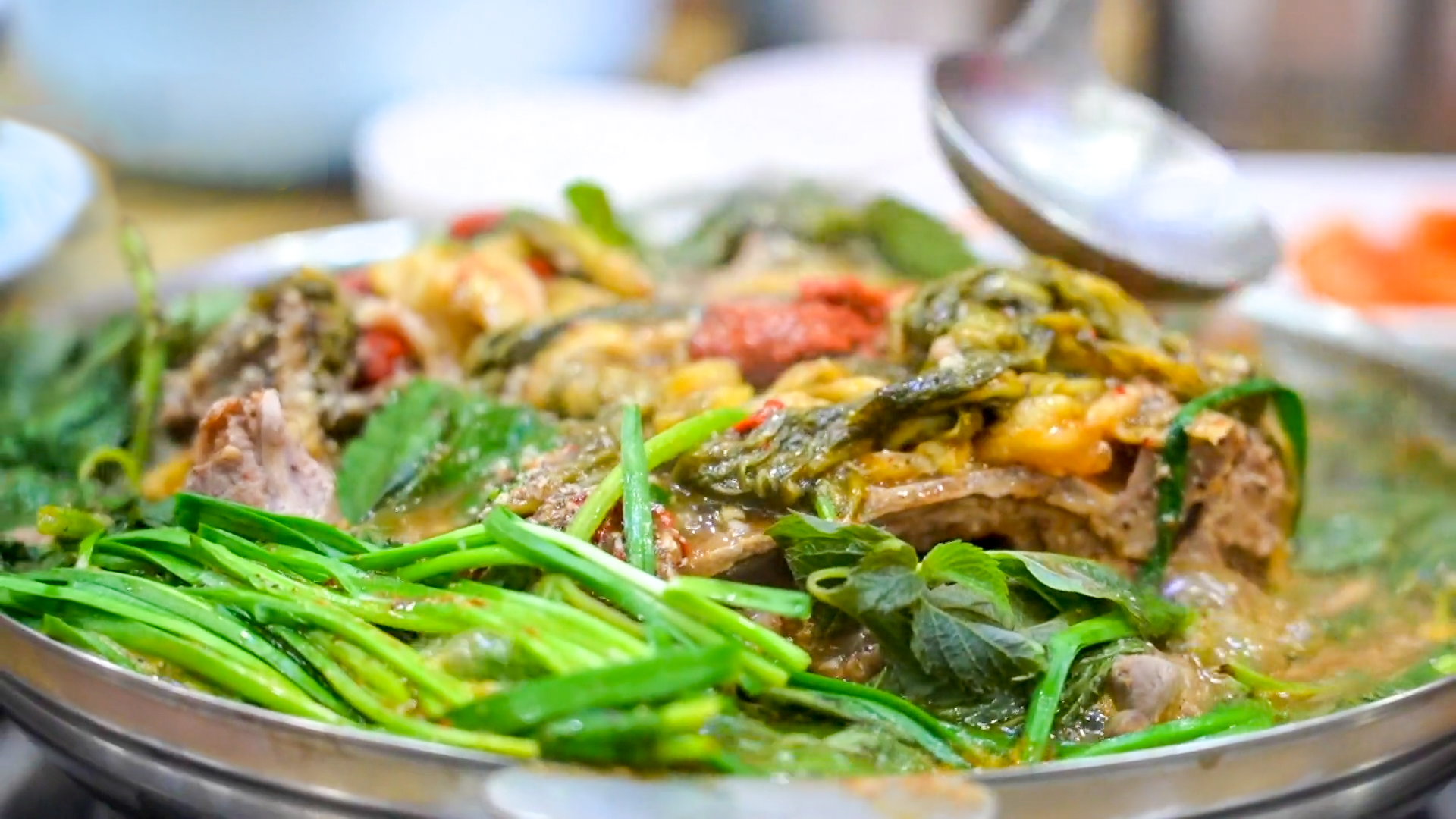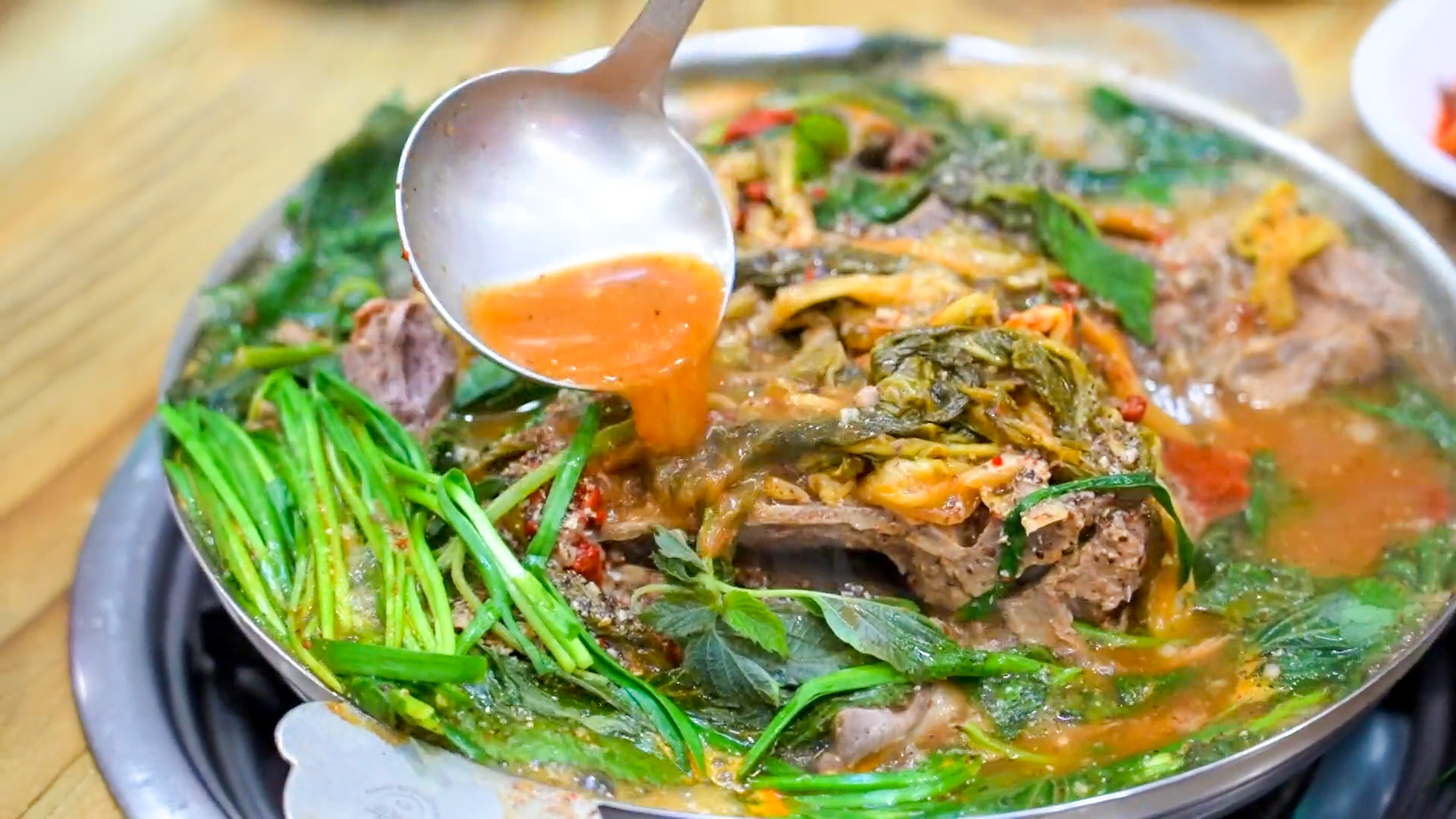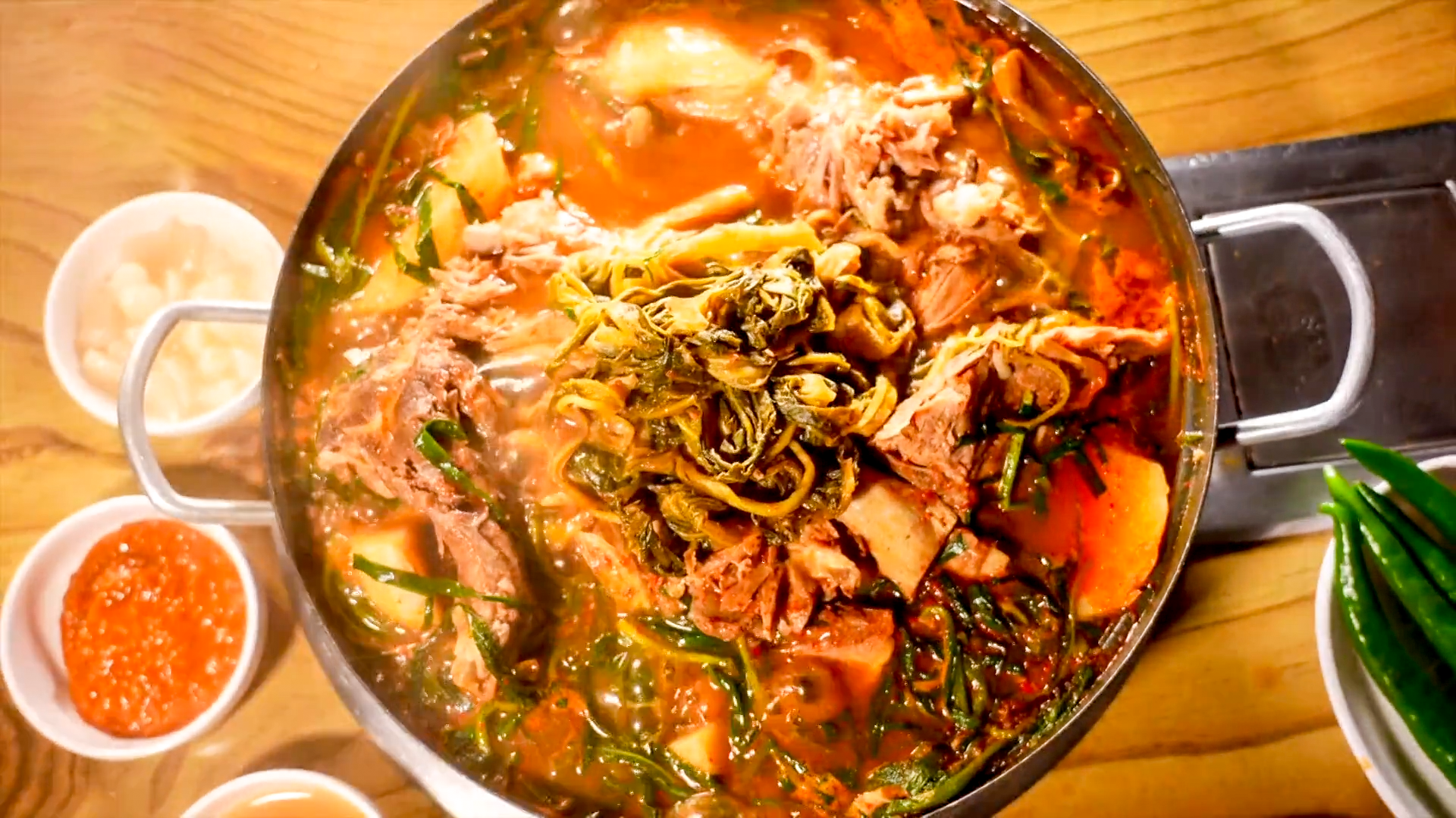 튼실한 뼈 고기 위에 우거지, 깻잎, 부추 등이 푸짐하게 올라가 있어 보기만 해도 군침을 흘리게 만드는 비주얼입니다.