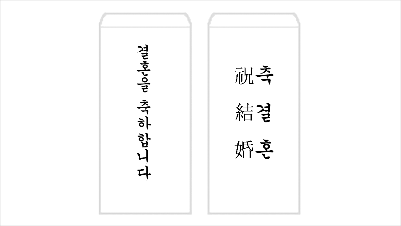 봉투에는 축 혼인(祝 婚姻), 축 결혼(祝 結婚), 축 화혼(祝 華婚), 축의(祝儀), 하의(賀儀), 경축(慶祝), 결혼을 축하합니다, 결혼을 진심으로 축하합니다, 혼인을 축하합니다, 혼인을 진심으로 축하합니다, 결혼을 경축합니다, 결혼을 진심으로 경축합니다, 혼인을 경축합니다, 혼인을 진심으로 경축합니다 등과 같이 축의 말을 적으면 됩니다. 한글이나 한자 둘 중 편한 글자로 적으면 됩니다.