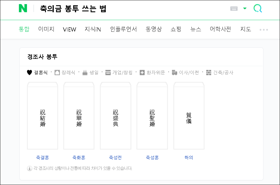 네이버에 검색하면 이렇게 나오는데 보고 베껴쓰기에도 어려운 한자들이 예시로 나와 있습니다. 자신의 사회적 지위를 고려하여 한자로 쓰고 싶은 경우에는 이렇게 한자로 써도 좋습니다. 다만 형식에 구애받지 않고 한글로 축 결혼, 축 화혼, 축성 전, 축성 혼, 하의 등으로 써도 무방합니다.