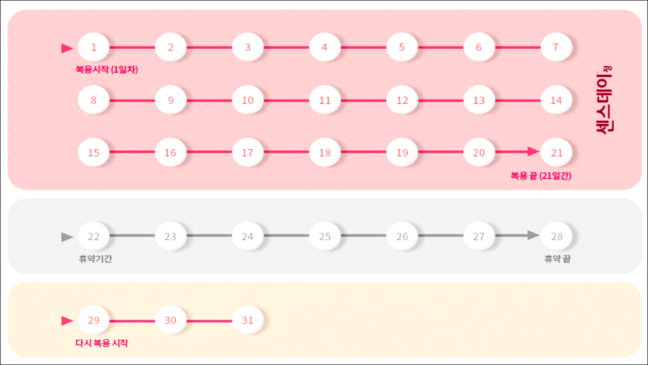 3. 7일간의 휴약기를 갖고 생리 시작 여부와 관계없이 다시 스케줄에 맞춰 복용을 시작합니다.