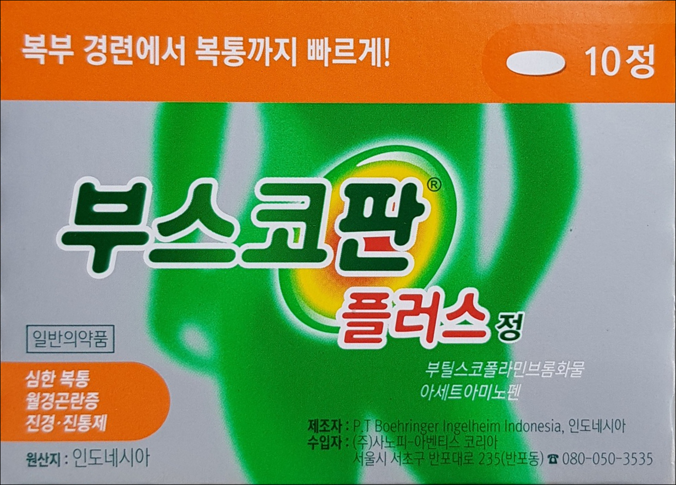 | 플러스 | 부틸스코폴라민브롬화물 10mg, 아세트아미노펜 500mg |