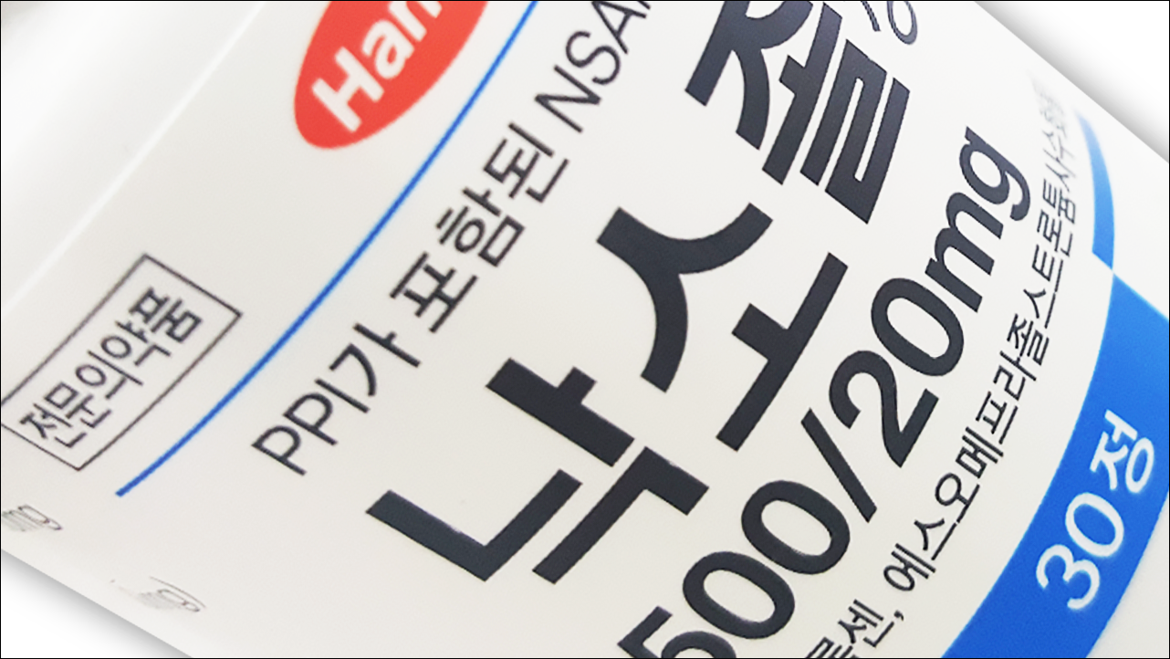 반면 이 약은 위산분비 억제제가 함유되어 있는 복합제제로 단일제로 되어 있는 소염진통제보다 위장장애 부담이 적습니다. 속방형인 에스오메프라졸이 먼저 방출돼 위장을 보호하고, 장용 코팅되어있는 나프록센이 이후 장에서 방출되기 때문에 나프록센의 위장관 부작용을 최소화하는 효능이 있습니다.