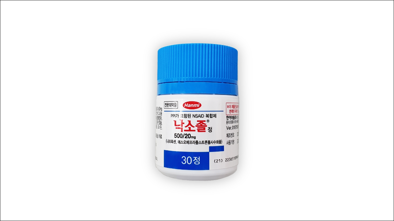 소염진통제 낙소졸정500/20mg에 대해서 알아보겠습니다. 비스테로이드성 소염진통제로 골관절염, 류마티스성 관절염, 강직성 척추염 등에 효과가 있으며 의사의 처방전이 있어야 약국에서 구입이 가능한 전문 의약품입니다. 일반 비스테로이드성 소염진통제의 경우 위장장애를 유발할 수 있지만 이 약은 위장약 성분이 함유되어 있어 소염진통제 복용으로 인한 위장장애 부담을 덜 수 있습니다.