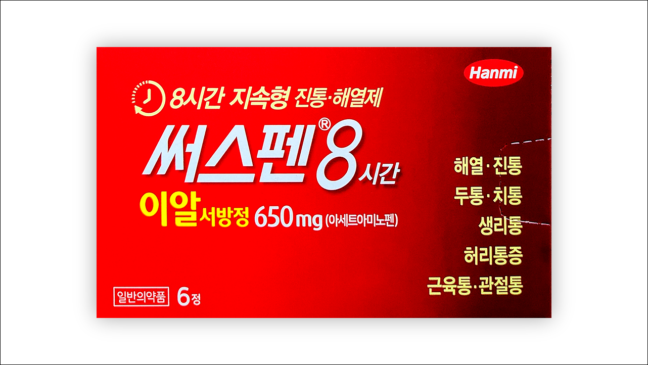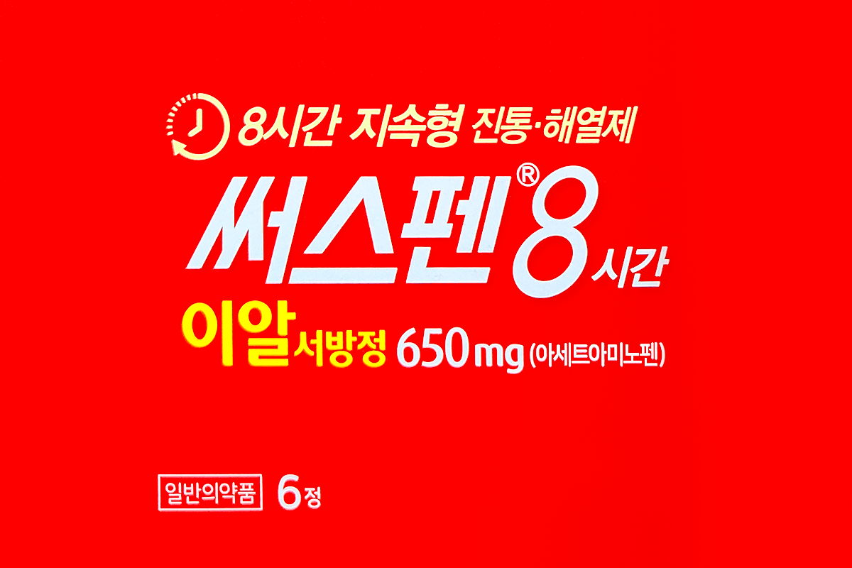 해열진통제 써스펜이알서방정(써스펜8시간이알서방정650mg)에 대해 알아보겠습니다. 해열, 진통, 두통, 치통, 생리통, 허리 통증, 근육통, 관절통 등에 효능이 있으며 의사의 처방전이 없어도 약국에서 구입이 가능한 일반 의약품입니다. 일반의약품이지만 보험이 적용되는 약으로 처방을 받아 복용이 가능하며 타이레놀과 동일한 성분의 약으로 타이레놀 대신 복용해도 되는 약입니다.