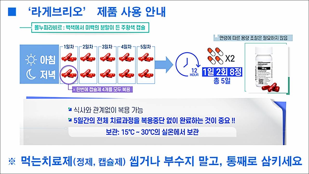 코로나 치료제로 주사형 치료제를 사용하기 어렵고 기존 먹는 치료제(팍스로비드)를 복용할 수 없는 환자에게 사용해 중증으로 악화되지 않도록 하는데 도움이 되는 약입니다. 만 60세 이상 고령층, 만 18세 이상 기저질환자와 면역 저하자 등도 복용이 가능하며 복용 시 약에 대한 정보를 참고하면 코로나 증상을 개선하는데 도움이 될 것입니다. 다음에서 라게브리오캡의 외형정보, 성분정보, 효능, 효과, 적용기준, 복용법, 용량, 사용상 주의사항, 부작용, 가격, 저장방법 등에 대해 좀 더 자세히 살펴보겠습니다.