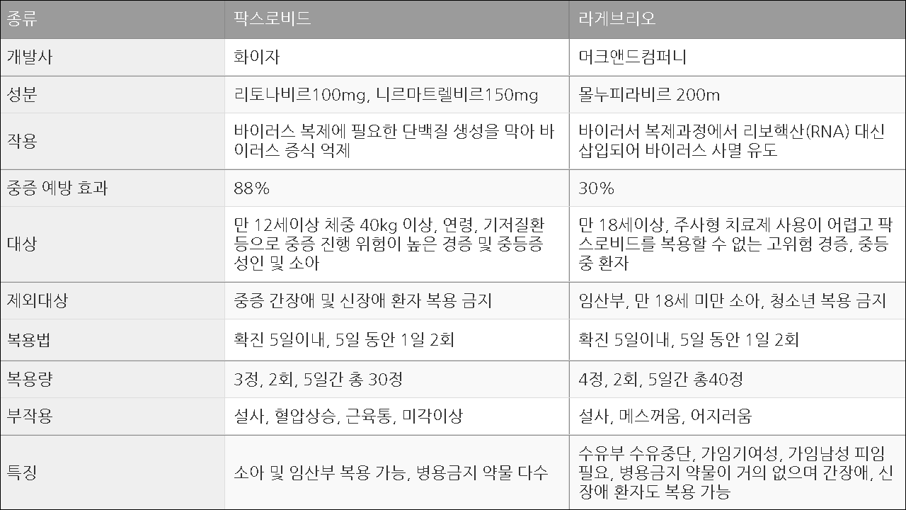 약물의 효능, 효과는 팍스로비드와 비교해 적지만 함께 복용을 금지하는 약물이 거의 없으며 부작용이 적습니다. 신장애, 간장애 등이 있는 중등도 중증 환자의 경우 팍스로비드는 복용을 권장되지 않지만 이 약은 처방이 가능합니다. 다만 반드시 의사와 상담 후 복용 여부를 결정해야 합니다.