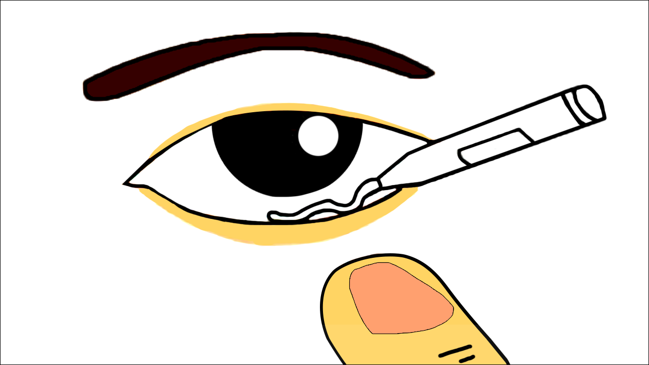 3. 고개를 충분히 뒤로 젖힌 후 눈을 위로 향하고 한손으로 아래쪽 눈꺼풀을 살며시 밑으로 잡아당겨 주머니 모양을 만든후 그 안쪽(아래 눈꺼풀 안쪽)에 가로 방향으로 길게 지시된 양을 발라줍니다. 바른후 눈을 감고 30초 정도 있어주며 눈을 2~3번 깜빡거려주면 약이 눈안으로 골고루 퍼지게 됩니다.