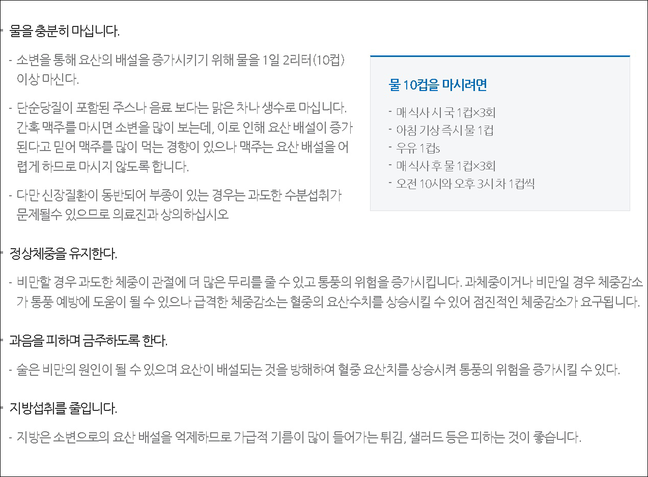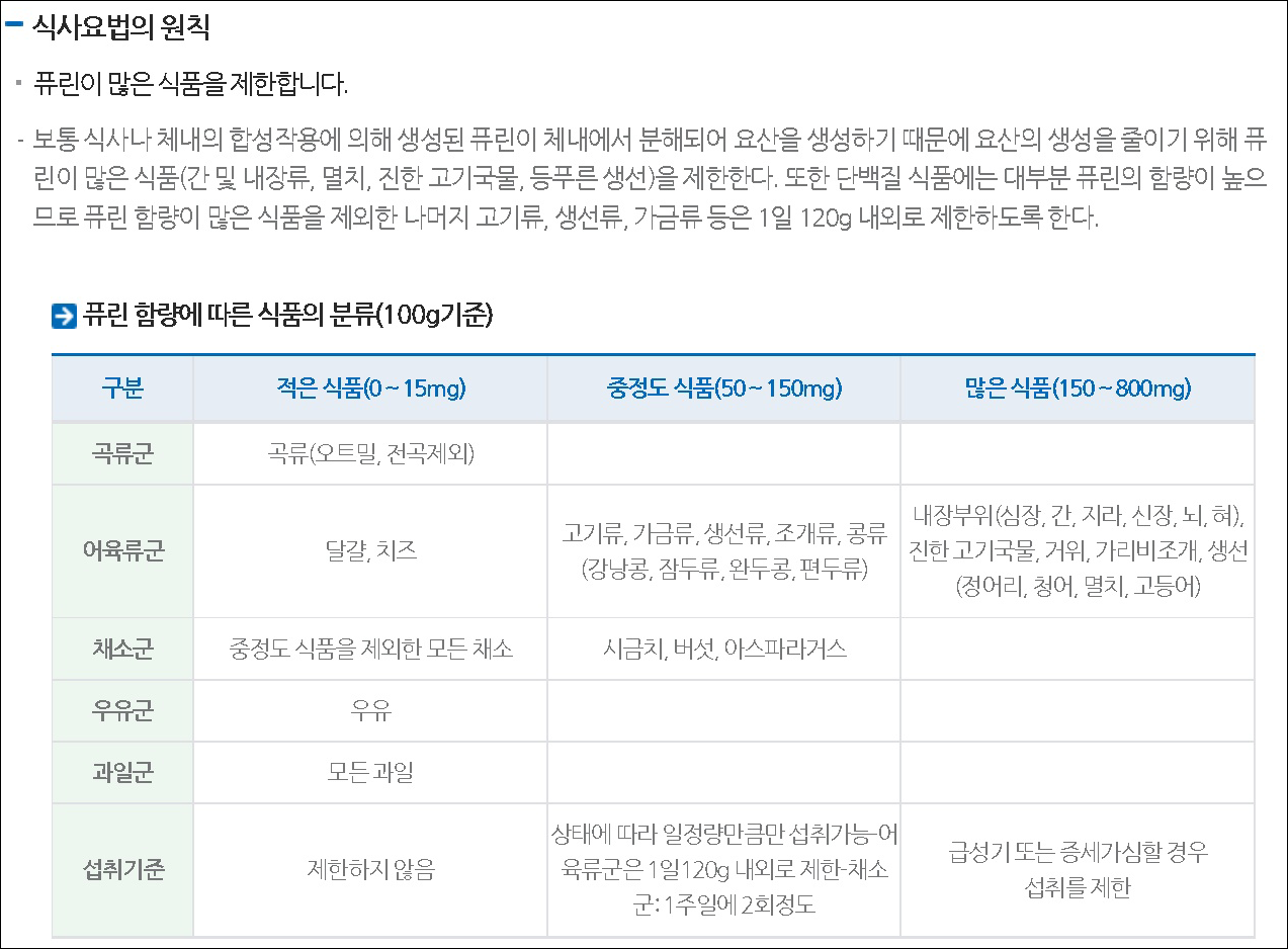 3. 퓨린이 많이 함유된 음식물을 적게 섭취하는 등 식이조절을 해야 하며 과음, 과식을 피하고 과체중이 되지 않도록 체중 관리에 신경을 써야 합니다.