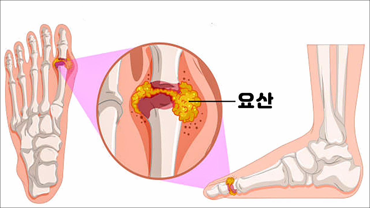 ④ 고요산혈증인 경우 통풍이 유발되지 않을 수도 있지만 과한 요산은 관절의 윤활막, 연골, 관절 주위 조직, 연부조직에 요산 나트륨 형태로 침착되어 통증과 염증을 유발하며 통풍 발작을 일으킵니다. 보통 체온이 낮은 부위에 요산 결정이 침착되기 쉽습니다. 특히 엄지발가락의 관절에 나타나기 쉬우며 발가락 외에도 손등, 손목, 무릎관절, 발목, 발등, 발꿈치, 아킬레스건 등에 심한 통증이 발생할 수 있습니다.