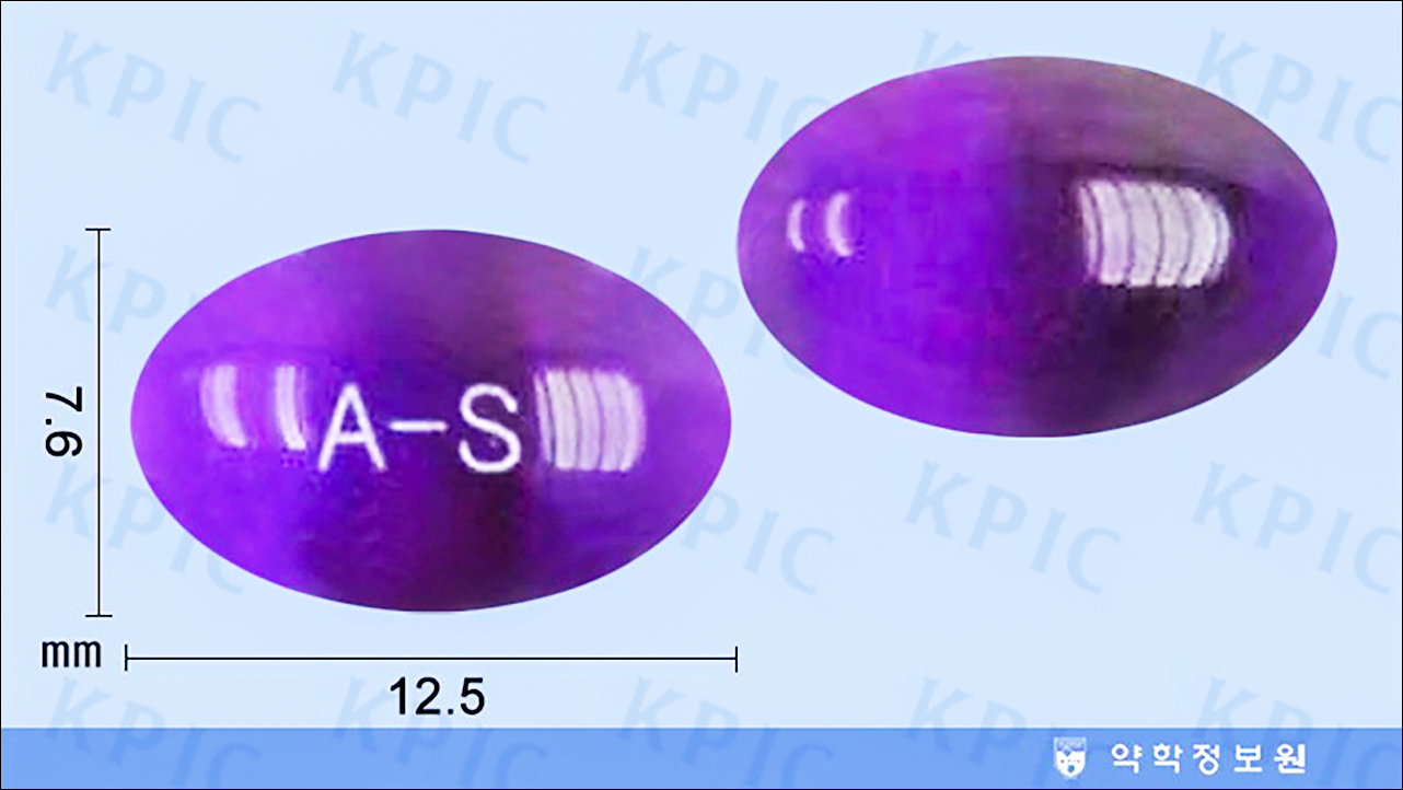 | 성상 | 무색 내지 연보라색의 내용물이 든 보라색의 투명한 타원형 연질캡슐 |