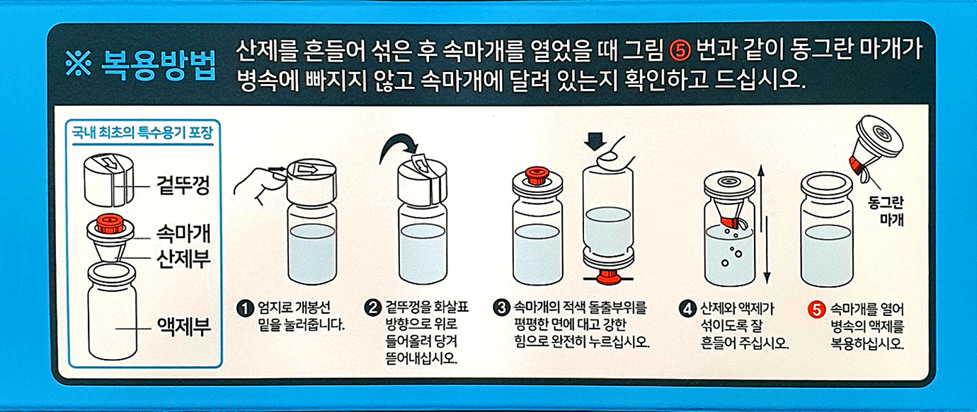 6. 이 약은 약물의 안정성을 위해 상부 용기 내의 산제와 하부 용기 내의 액체가 분리되어 있으므로 복용 직전에 혼합하여 흔들어서 복용합니다.