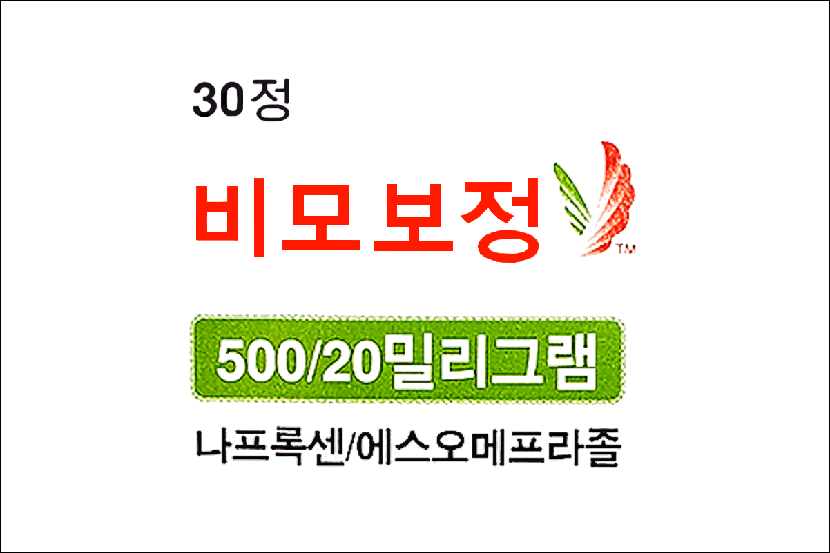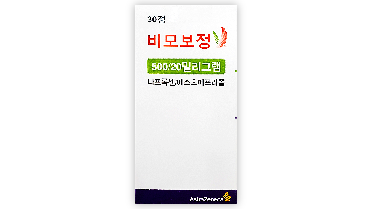 비모보정에는 나프록센 500mg, 에스오메프라졸마그네슘삼수화물 22.3mg이 함유되어 있습니다. 나프록센은 다른 비스테로이드성 소염진통제와 마찬가지로 프로스타글란딘 합성을 담당하는 시클로옥시게나아제(COX-1, COX2) 효소를 억제해 해열, 소염, 진통 작용을 하며, 에스오메프라졸마그네슘삼수화물은 위산을 덜 분비하게 하는 성분으로 위장 보호작용을 합니다. 나프록센으로 인한 위장관 부작용 발생을 최소화한 약물입니다.