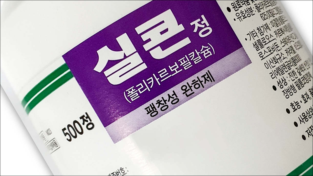 실콘정에는 폴리카르보필칼슘 625mg이 함유되어 있습니다. 폴리카르보필은 친수성을 띠는 유기화합물로, 수분에 대한 결합력이 커서 장내 수분을 흡수해 대변의 부피를 늘리고 대장의 압력을 증가시켜 연동운동을 활발하게 촉진시키는 기능을 합니다.