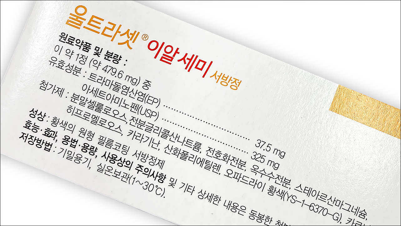 울트라셋이알세미서방정에는 아세트아미노펜 325mg, 트라마돌염산염 37.5mg이 함유되어 있습니다.
