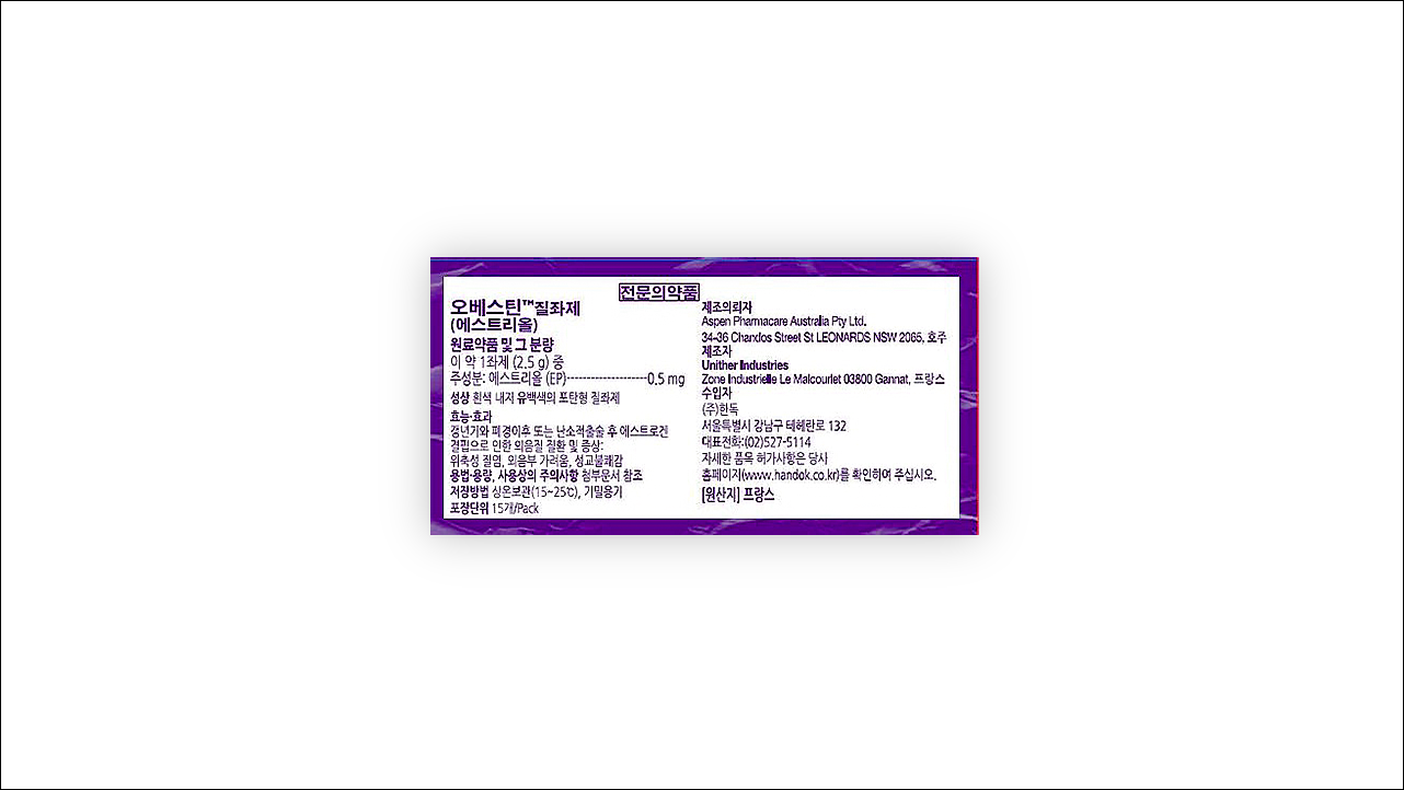 오베스틴질좌제에는 에스트리올 0.5mg이 함유되어 있습니다. 에스트리올 에스트로겐제제로 여성호르몬 감소로 인해 나타날 수 있는 증상(생리불순, 질건조, 두통, 복통, 밤에 더위를 느끼고, 우울, 불안, 수면장애 등)을 치료하는 데 사용되는데 에스트로겐 수용체를 활성화시켜 폐경기 여성의 호르몬 대체 요법, 불임 치료 등에 사용됩니다.