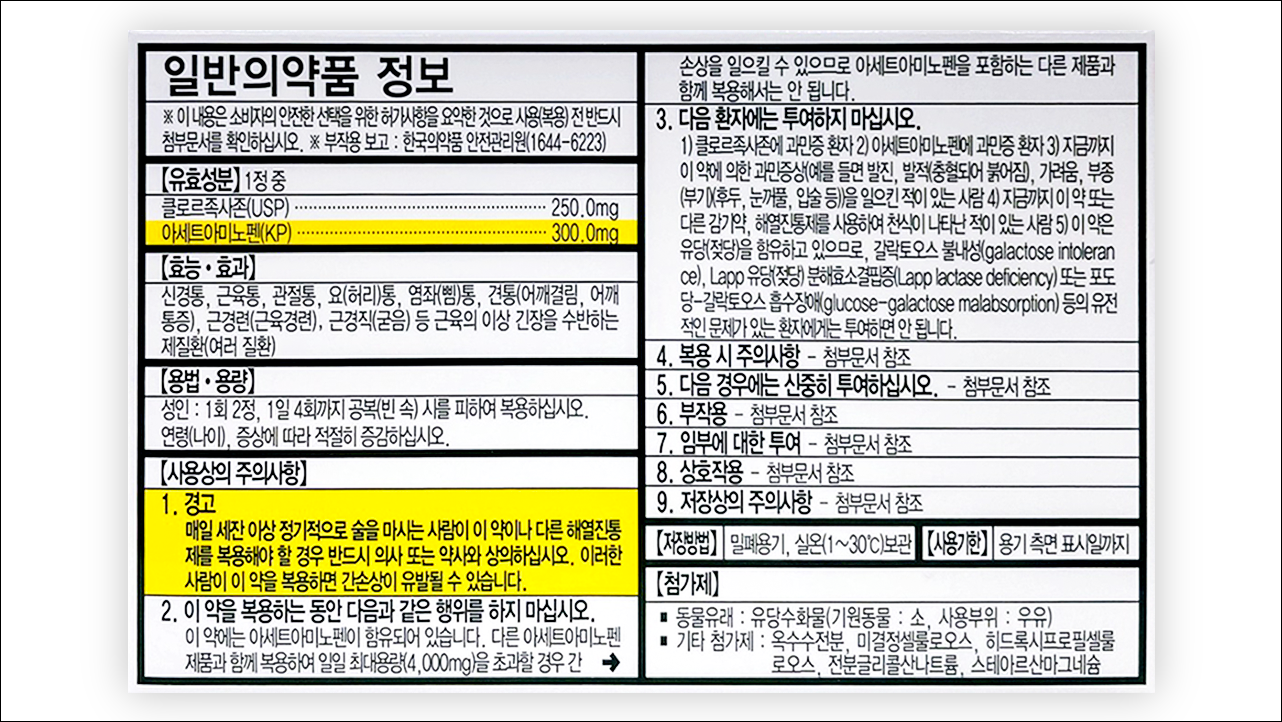 이 약에는 아세트아미노펜이 함유되어 있습니다. 다른 아세트아미노펜 제품과 함께 복용하여 일일 최대 용량(4,000mg)을 초과할 경우 간 손상을 일으킬 수 있으므로 아세트아미노펜을 포함하는 다른 제품과 함께 복용해서는 안 됩니다.