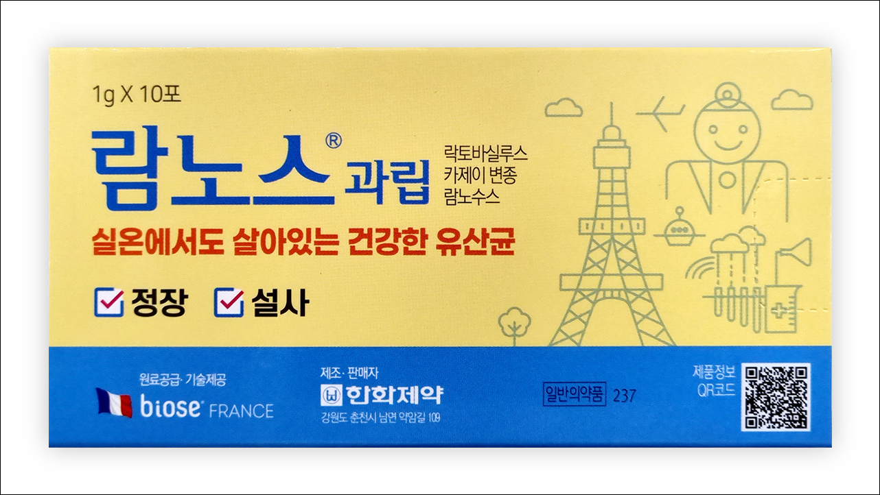설사약 람노스과립 1g (Ramnos Granule1g)에 대해서 알아보겠습니다. 유산균 정장제로 의사의 처방전이 없어도 약국에서 구입이 가능한 일반 의약품입니다. 정장생균제로 분류되어 있으며, 급성세균성 장염에 의한 설사, 항생제와 같은 약물로 인한 설사 등에 처방되기도 하는 유산균입니다. 2세 이상부터 임산, 고령층까지 모두 복용이 가능한 약입니다. 정장제란 설사, 장내 이상 발효를 줄여주고 장기능을 개선시켜주는 약을 말합니다.