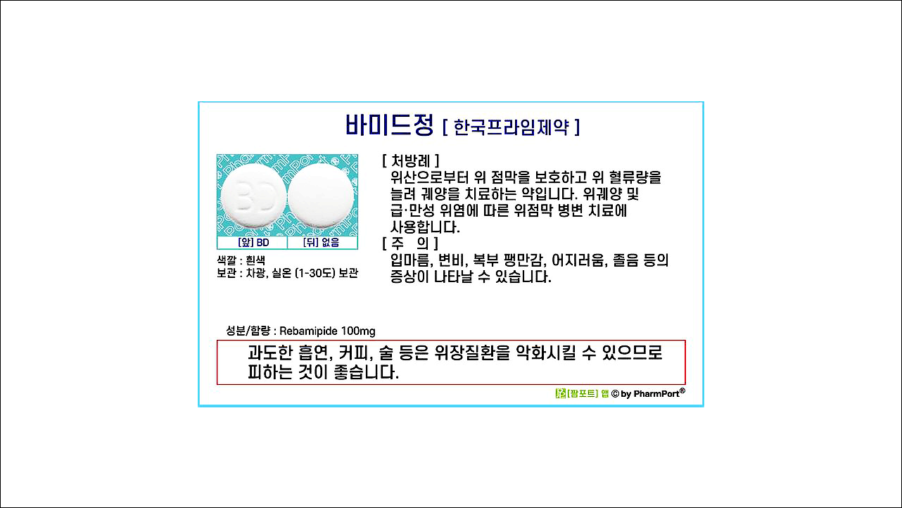 과량으로 복용해서는 안되며, 발진, 발적, 가려움증 등의 증상이 나타날 경우 의사의 상담을 받아야 합니다. 과도한 흡연, 커피, 술(알코올) 등은 위장질환을 악화시킬 수 있으므로 피하는 것이 좋습니다. 이상으로 바미드정의 외형정보, 성분정보, 효능, 효과, 용법, 용량, 사용상 주의사항, 부작용, 저장방법 등에 살펴보았습니다.