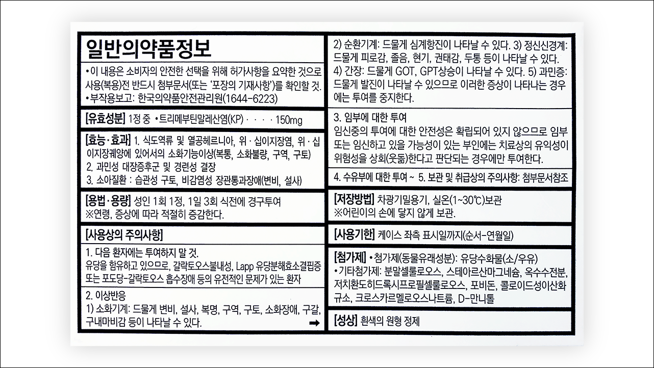 트리메부틴말레산염 150mg이 함유되어 있습니다. 트리메부틴은 위장관 운동이 항진된 상태나 저하된 상태를 정상화시키는 약물입니다. 위장관 평활근에 직접 작용해 위 배출을 촉진하고, 장 수축성을 조절하는 약입니다. 위장관 운동을 정상적인 상태로 조절하므로 위장질환에 따른 복통, 소화불량, 구역, 구토 등의 소화이상뿐만 아니라 과민성 대장 증후군, 경련성 결장, 소아의 습관성 구토, 변비, 설사 등의 증상을 치료하는 데 사용됩니다.
