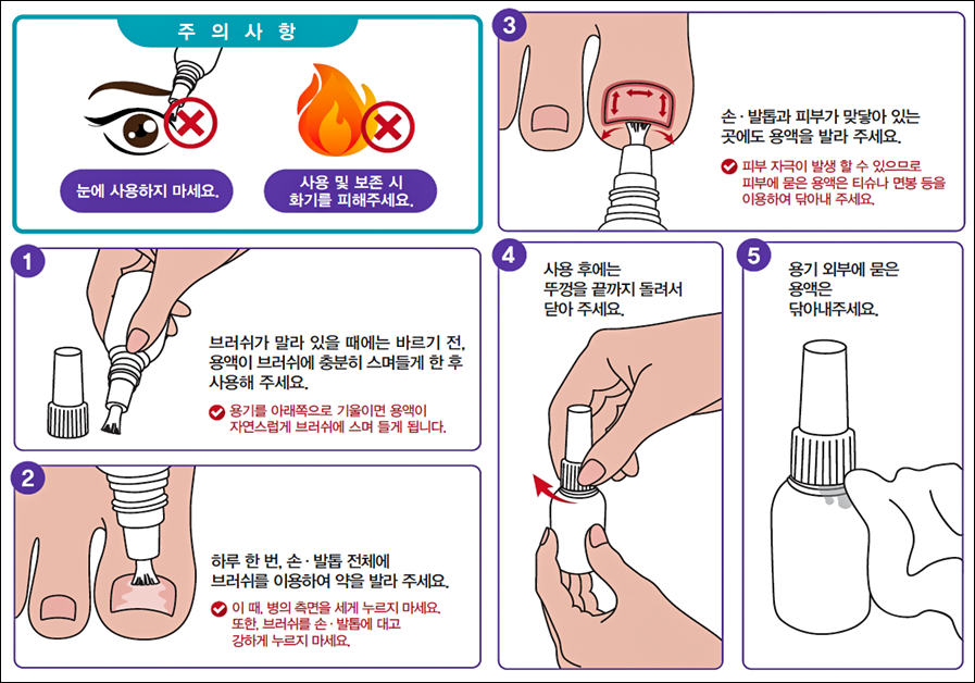 1. 이 약을 바르기 전에 손발톱을 깨끗이 씻은 후 완전히 건조시킵니다.