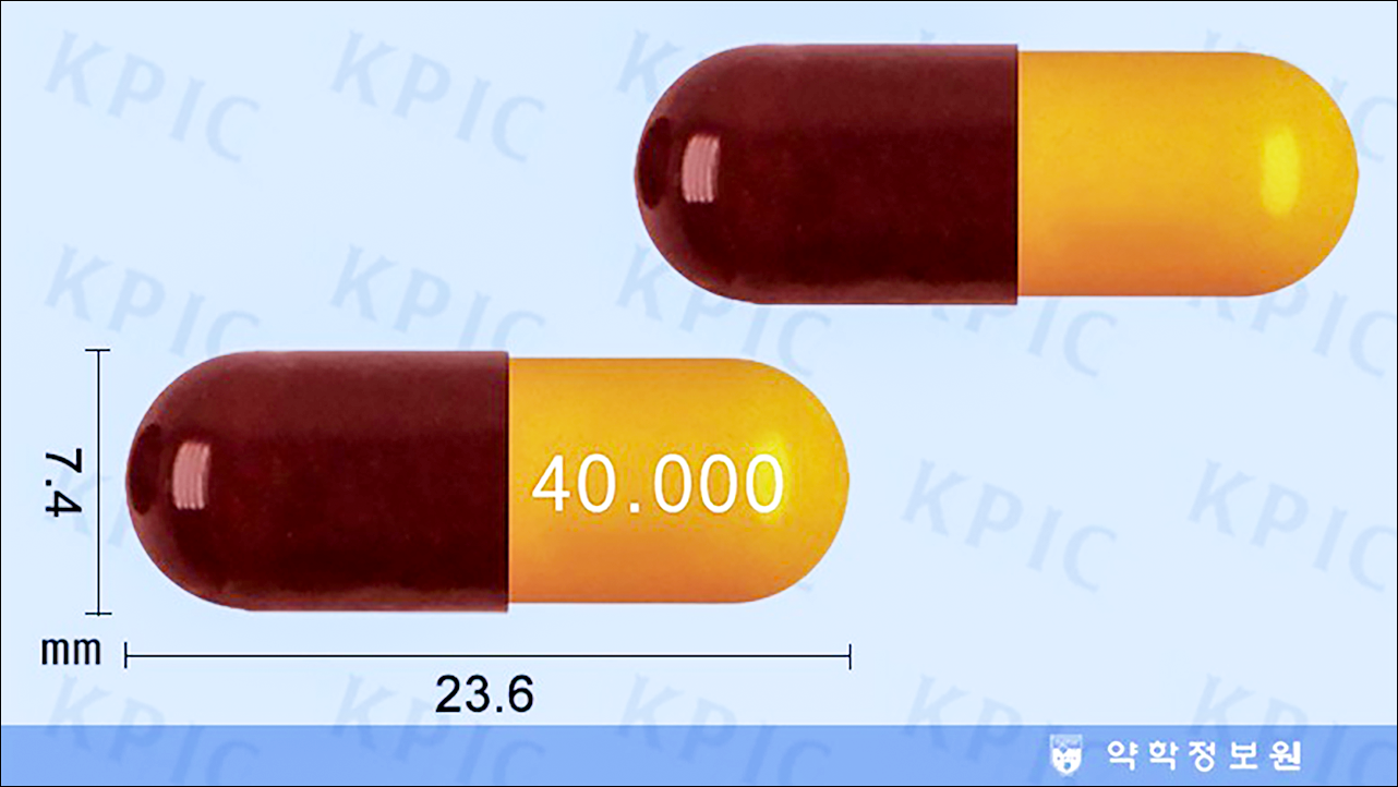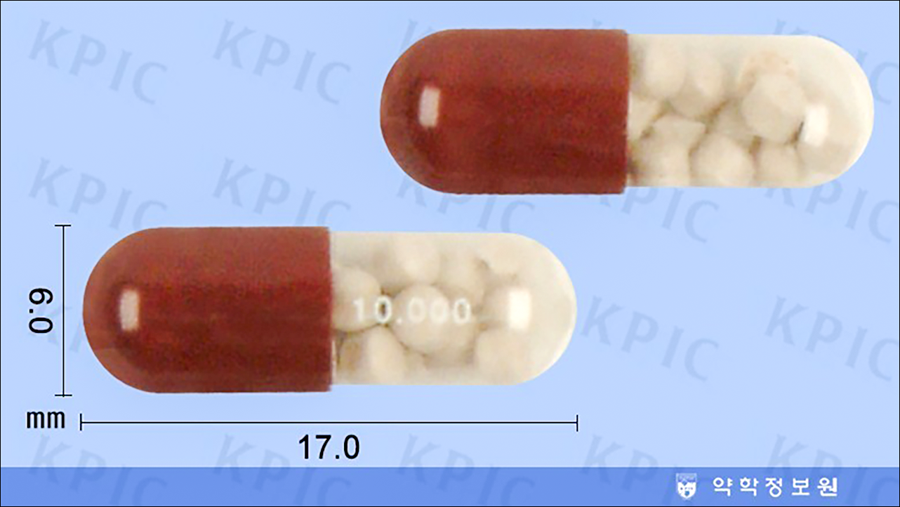 성상 : 독특한 향의 회백색 장용성 제피정을 함유하는 상부 불투명 갈색, 하부 투명한 무색의 경질캡슐