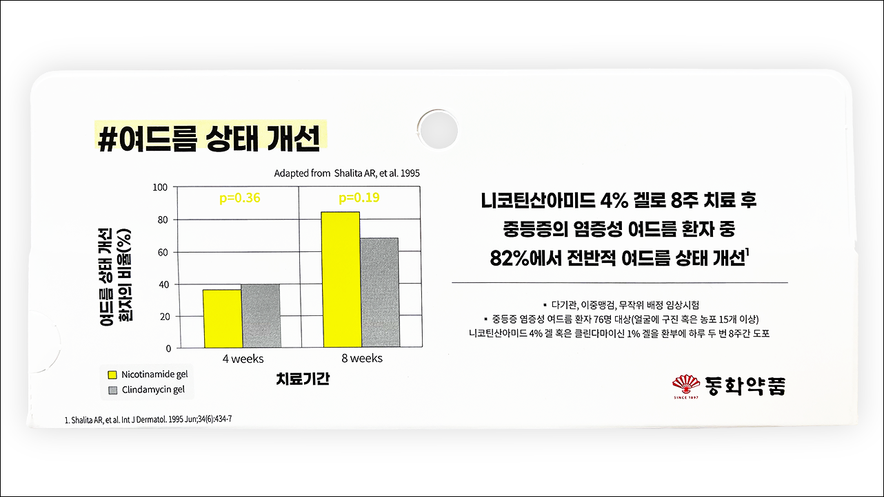비타민B3로 이루어진 연고이기 때문에 다른 여드름 치료제와 비교해 내성이나 피부자극감이 적습니다. 붉은기가 있는 여드름에 내성발현 걱정 없이 사용가능하며 직접 피부에 발생하는 자극감이 적어 부담 없이 장기간 사용이 가능합니다. 장기적으로 여드름을 치료하려는 경우 도움이 될 수 있습니다.
