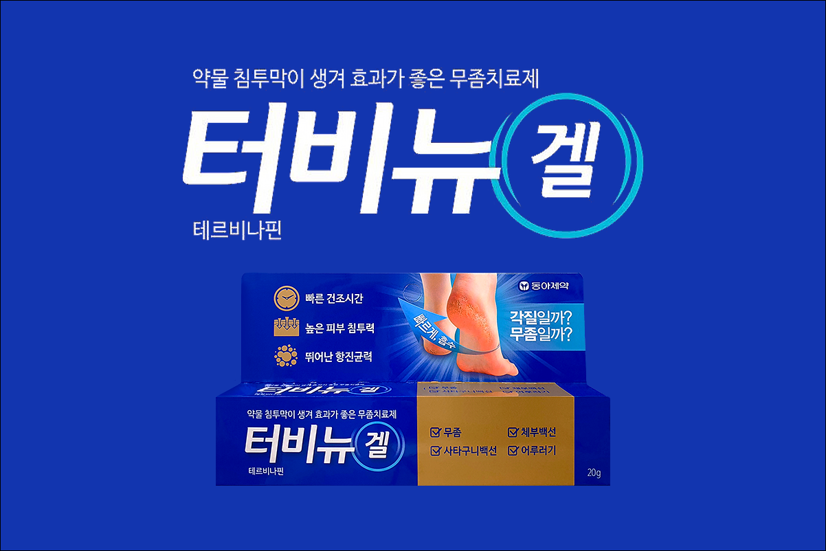 무좀약 터비뉴겔(Terbinew Gel)에 대해서 알아보겠습니다. 항진균 작용을 나타냄으로써 곰팡이균(진균)에 의한 피부 감염증을 치료하는 약으로 의사의 처방전이 없어도 약국에서 구입이 가능한 일반 의약품입니다. 진균이 원인인 무좀, 사타구니백선, 체부백선, 어루러기 등에 사용합니다.