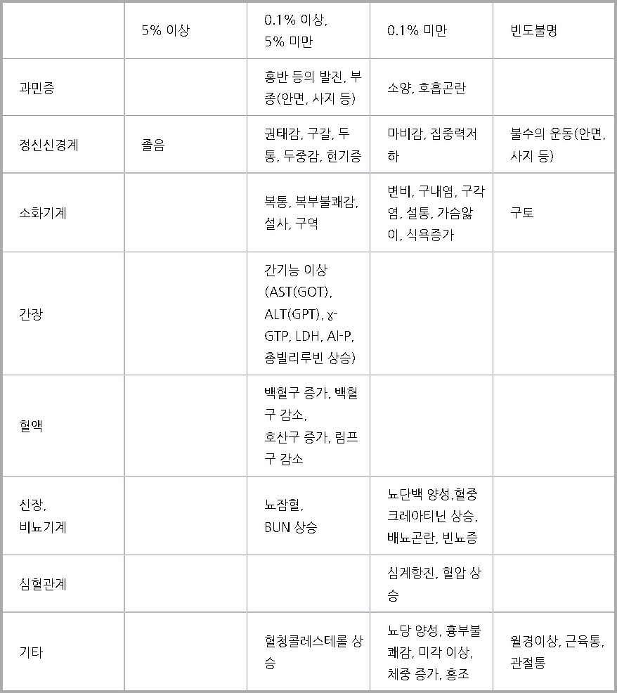 주요 이상반응은 졸음, ALT(GPT) 상승, AST(GOT) 상승, 백혈구 증가, γ-GTP 상승 등이었습니다.