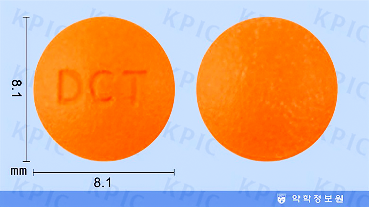 성상 : 주황색의 원형 필름 코팅정이며 본품의 나정은 백색의 원형정제입니다.