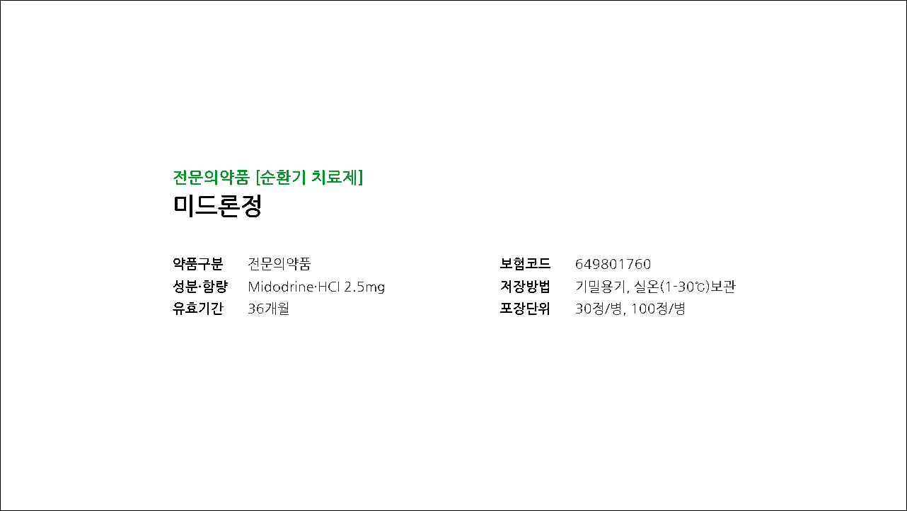 미드론정에는 미도드린염산염 2.5mg이 함유되어 있습니다. 미도드린 (midodrine)은 혈압을 높이는 승압제, 항저혈압제입니다. 교감 신경 알파원(α1) 수용체에 작용하여 혈관을 수축시키는 약물로 기립성 저혈압과 혈관 미주 신경성 실신에 모두 효과가 있습니다. 뇌 혈액 장벽을 통과하지 못하여 대뇌나 심장에 미치는 영향이 미미합니다.