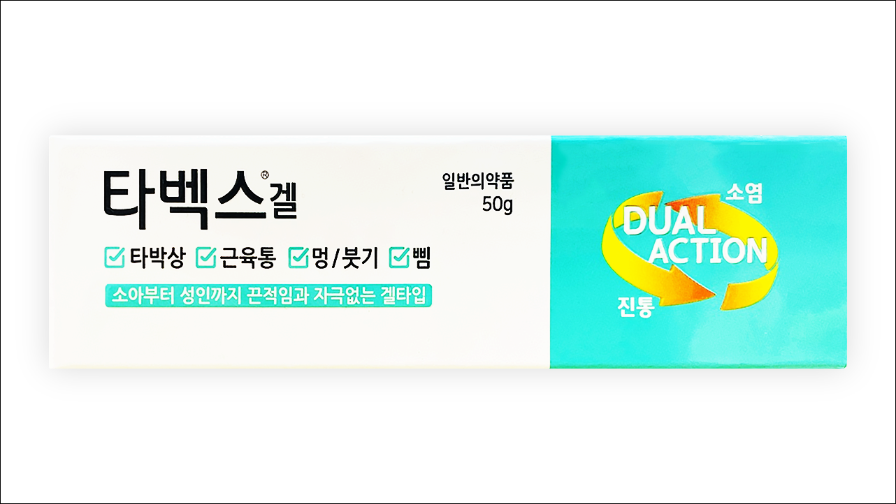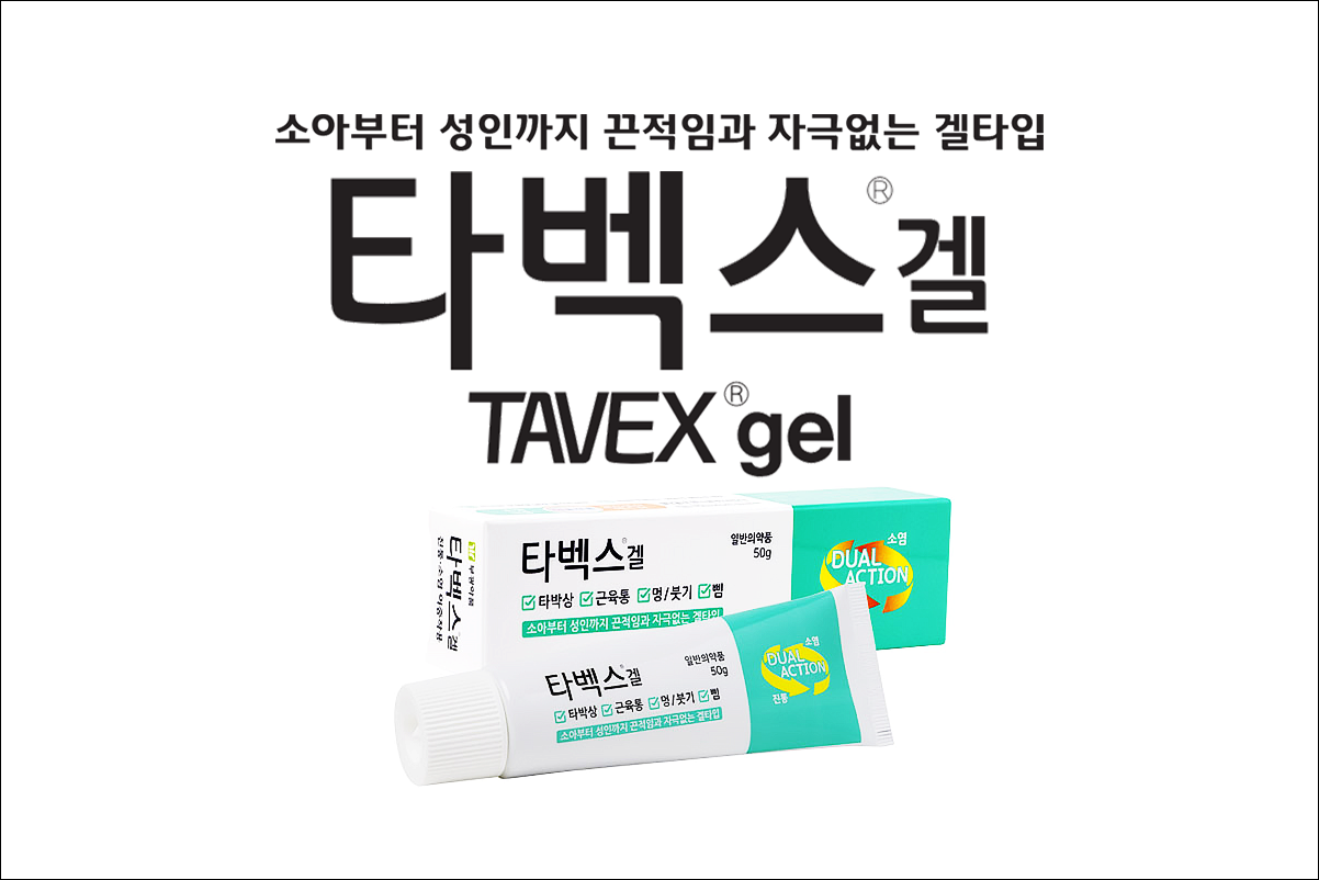 소염진통제 타벡스겔(Tavex Gel)에 대해서 알아보겠습니다. 타박상, 근육통, 멍, 붓기, 삠 등에 효과가 있는 바르는 파스(붓기, 멍 빼는 약)로 의사의 처방전이 없어도 약국에서 구입이 가능한 일반 의약품입니다. 염증을 완화시키고, 통증을 해소하는 약입니다. 소아부터 사용할 수 있는 안전성이 확보된 약으로 소아부터 성인까지 자극 없이 사용가능하며 소염, 진통 이중작용의 강한 외용 소염진통제입니다.