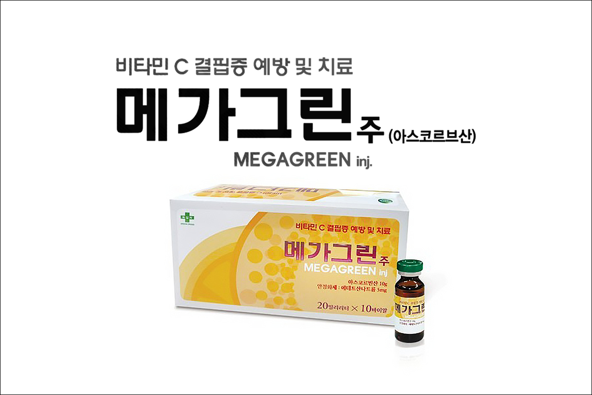 비타민 C제 메가그린주 (Megagreen Inj)에 대해서 알아보겠습니다. 비타민을 공급하는 주사제로 의사의 처방이 있어야 투여가 가능한 전문 의약품입니다. 비타민C의 결핍과 관련된 질환의 예방 및 치료를 위해 사용하는 약입니다.