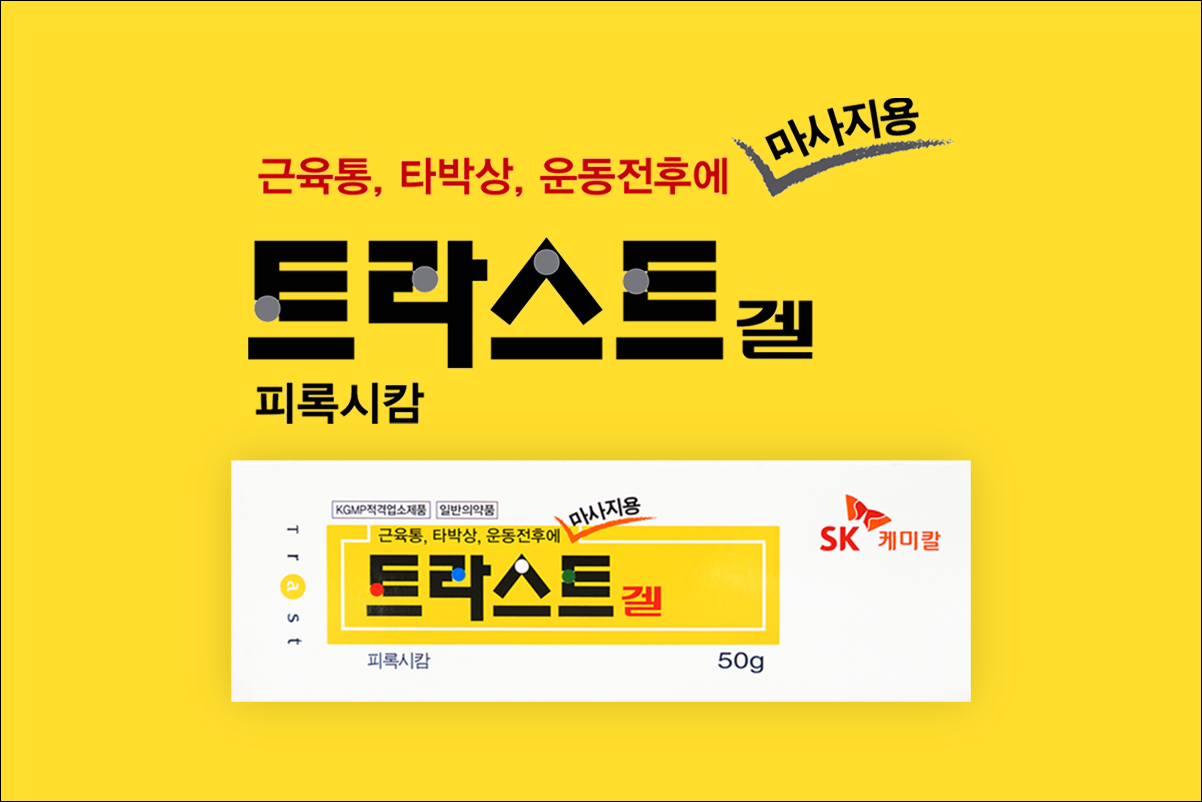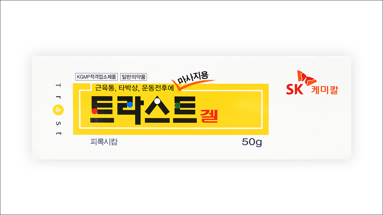 바르는 근육통 치료제 트라스트겔(Trast Gel)에 대해서 알아보겠습니다. 비스테로이드성 소염진통제(NSAIDs)로 의사의 처방전이 없어도 약국에서 구입이 가능한 일반 의약품입니다. 관절염, 근육통, 외상 후 종창이나 동통 등의 증상을 완화시켜 주는 소염, 진통제입니다. 근육통, 타박상, 운동전후 마사지용으로 사용하며, 염증을 완화시키고, 통증을 해소하는 약입니다.