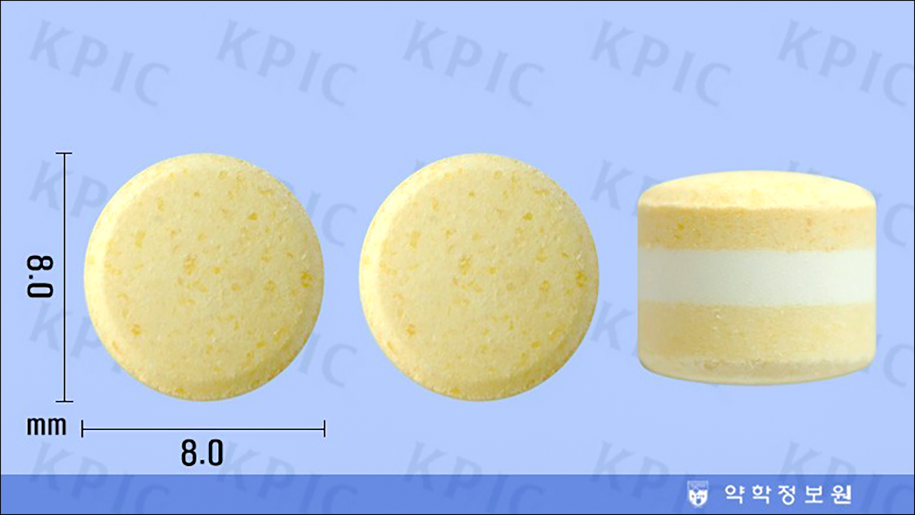 성상 : 이 약은 2개의 황색층 사이에 1개의 흰색층이 삽입되어 있는 총 3층으로 이루어진 양쪽이 볼록한 원형정제입니다.