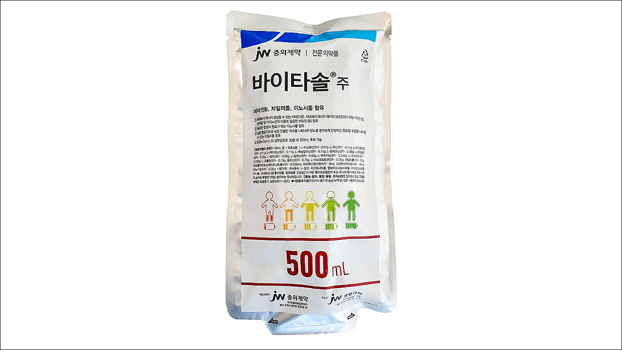 아미노산 수액제 바이타솔주(Vaitasol Inj.)에 대해서 알아보겠습니다. 단백아미노산제제로 의사의 처방이 있어야 투여가 가능한 전문 의약품입니다. 영양수액제로 아미노산 보급제입니다.