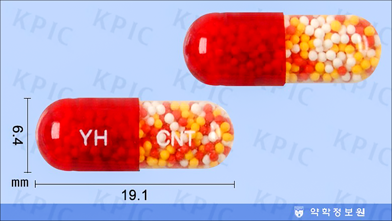 성상 : 흰색, 적색 및 노란색의 구형과립이 충진 된 상부 적색투명, 하부 무색투명의 경질캡슐입니다.