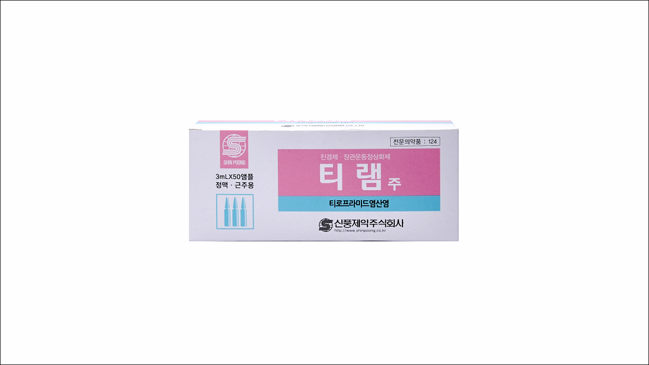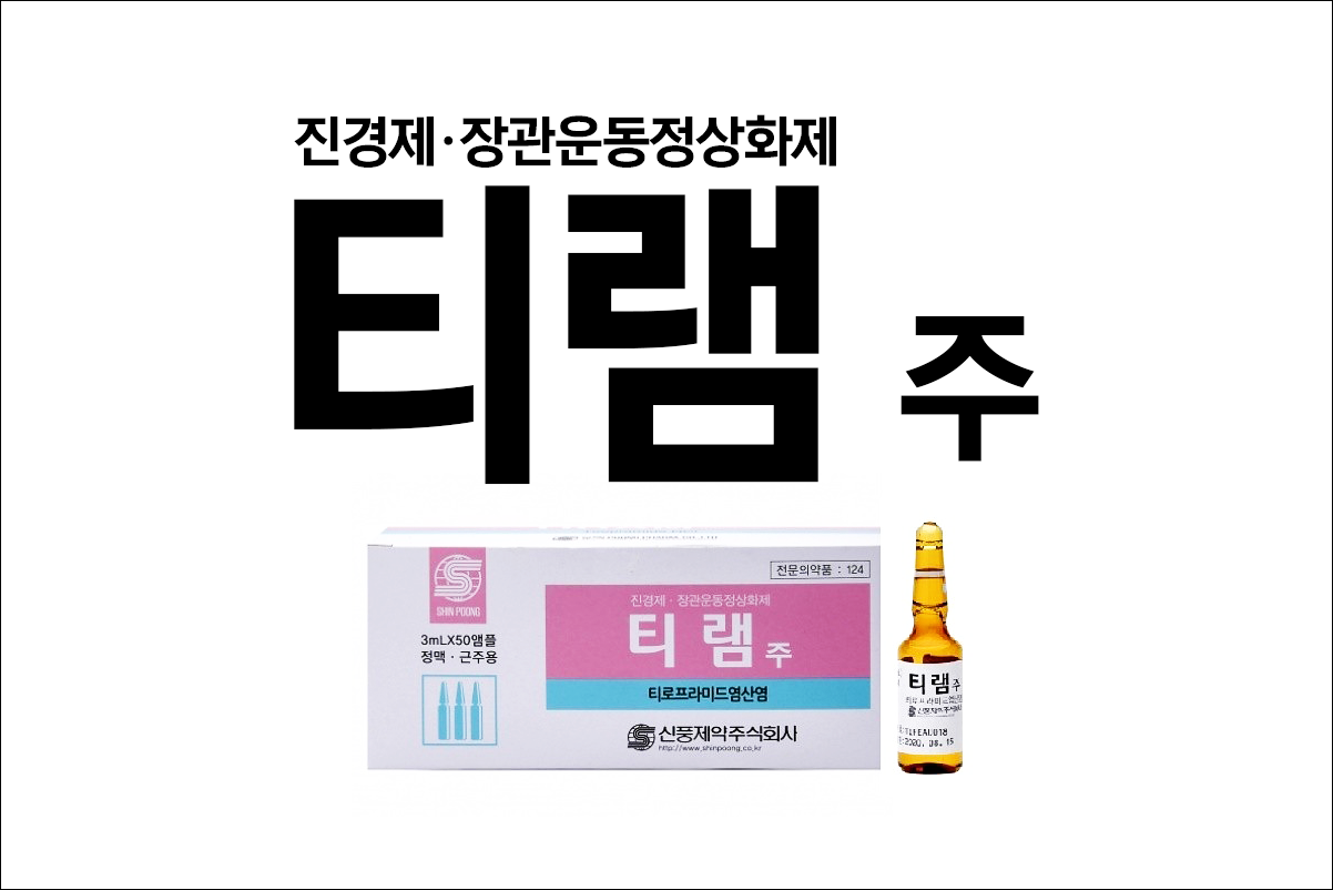 경련완화제 티램주(Tiram Injection)에 대해서 알아보겠습니다. 각종 통증을 완화해주는 진경제로 의사의 처방이 있어야 투여가 가능한 전문 의약품입니다. 위산분비를 억제하며, 평활근 경축을 완화시킴으로써 항경련 및 진통 효과를 나타내는 약입니다.