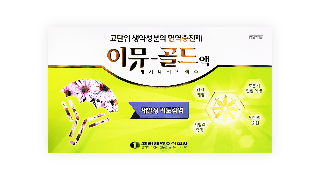 면역증진제 이뮤골드액(Immugold Sol.)에 대해서 알아보겠습니다. 고단위 생약성분의 면역증진제로 의사의 처방전이 없어도 약국에서 구입이 가능한 일반 의약품입니다. 면역기능을 회복, 증진시킴으로써 면역결핍으로 인한 각종 질환을 예방 및 치료하는 약입니다. 마른기침, 기관지염, 편도염 등에 효능이 있습니다.
