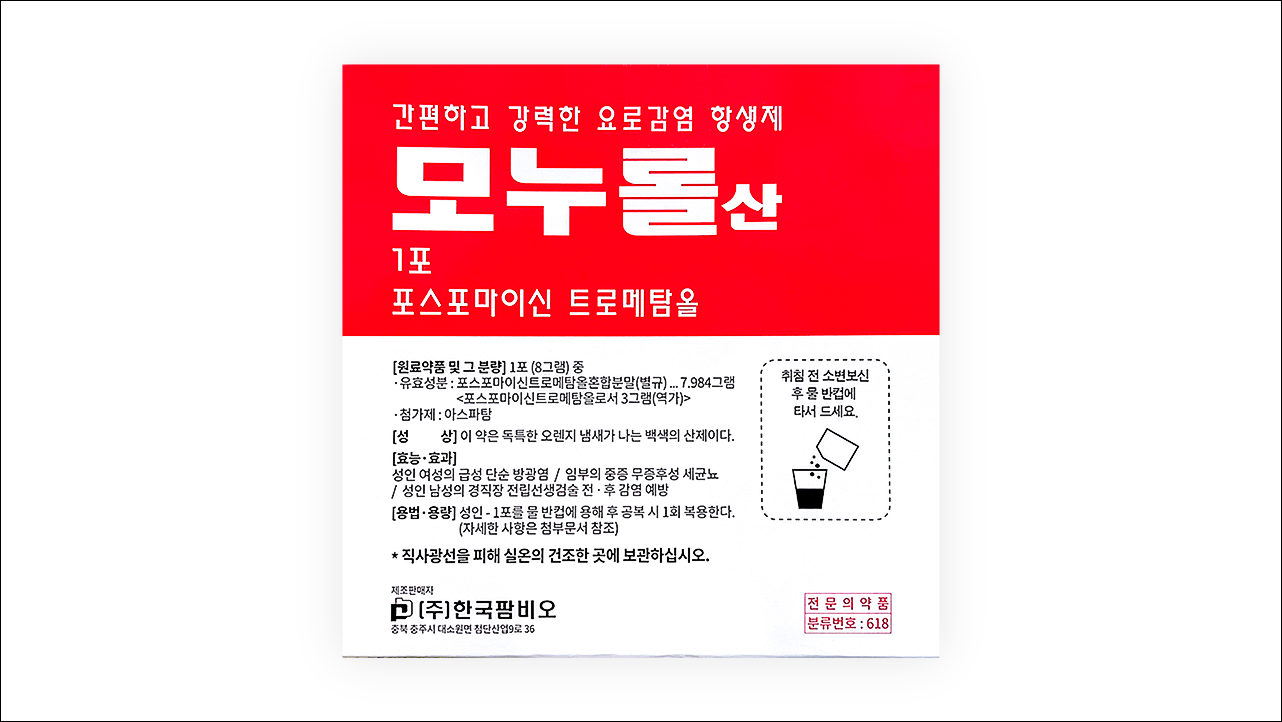 모누롤산에는 포스포마이신트로메탐올혼합분말 7.984g이 함유되어 있습니다. 간편하고 강력한 요로감염 항생제입니다.