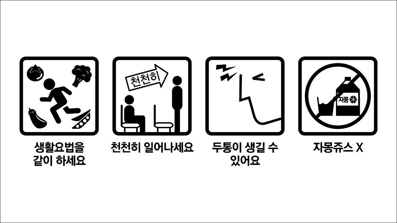 2. 장시간 눕거나 앉은 자세에서 일어나는 경우 천천히 일어납니다.