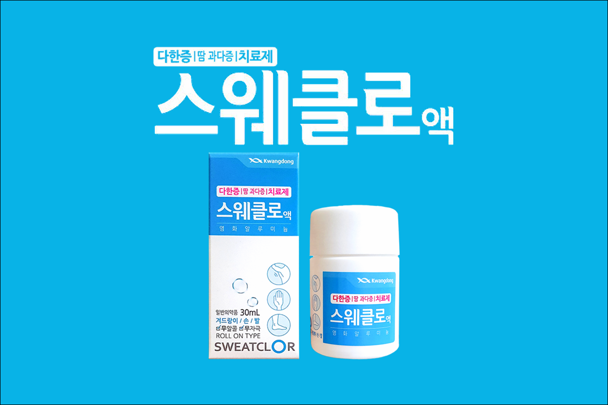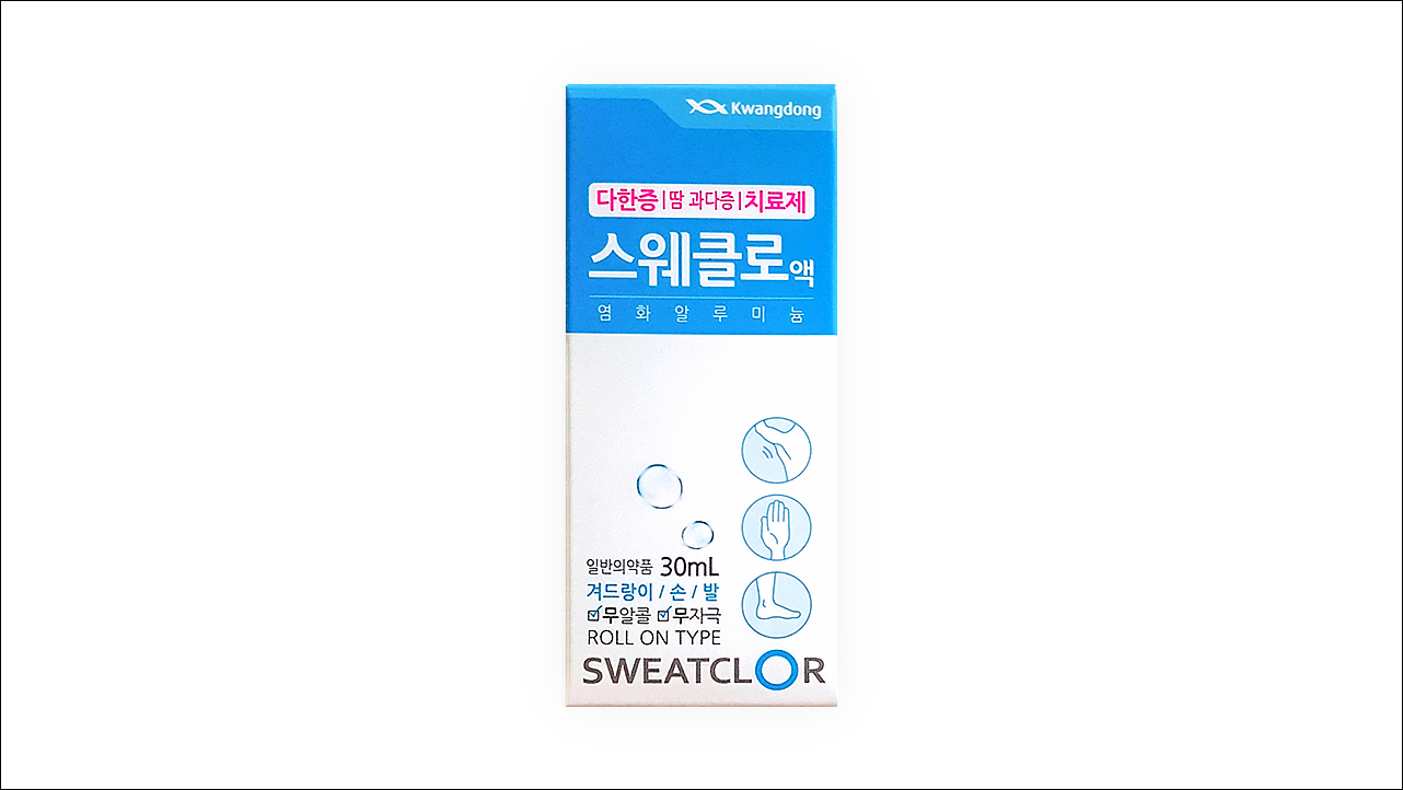 땀억제제 스웨클로 액(Sweatclor Soln.)에 대해서 알아보겠습니다. 다한증, 땀 과다증 치료제(발한제, 지한제)로 의사의 처방전이 없어도 약국에서 구입이 가능한 일반 의약품입니다. 땀구멍을 막아 땀분비를 억제함으로써 다한증을 치료하는 약입니다.