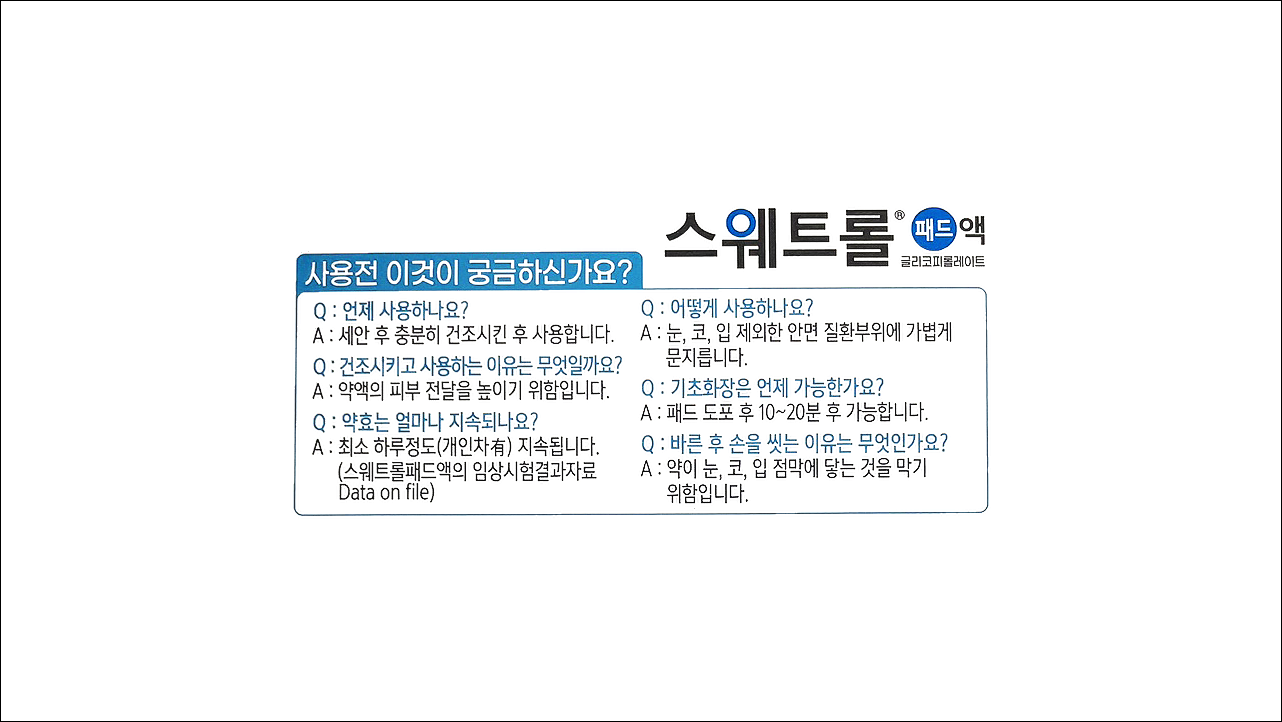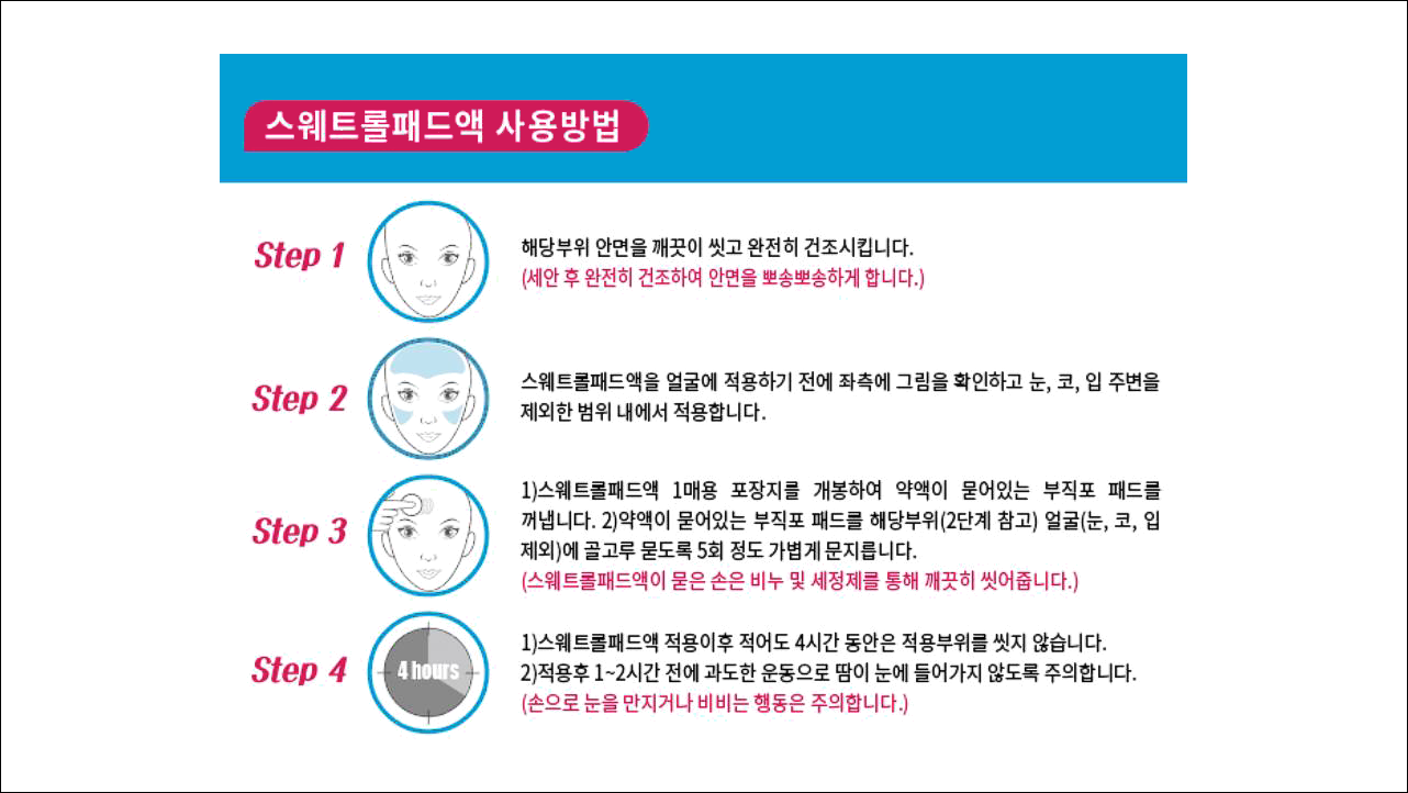 이 약을 사용하는 동안 부작용이 나타날 수 있으므로 주의해야 합니다. 사용 시 약에 대한 정보를 참고하면 얼굴에 과도한 땀이 분비되는 증상을 개선하는데 도움이 될 것입니다. 다음에서 스웨트롤 패드액의 외형정보, 성분정보, 효능, 효과, 용법, 용량, 사용상 주의사항, 부작용, 가격, 저장방법 등에 대해 좀 더 자세히 살펴보겠습니다.