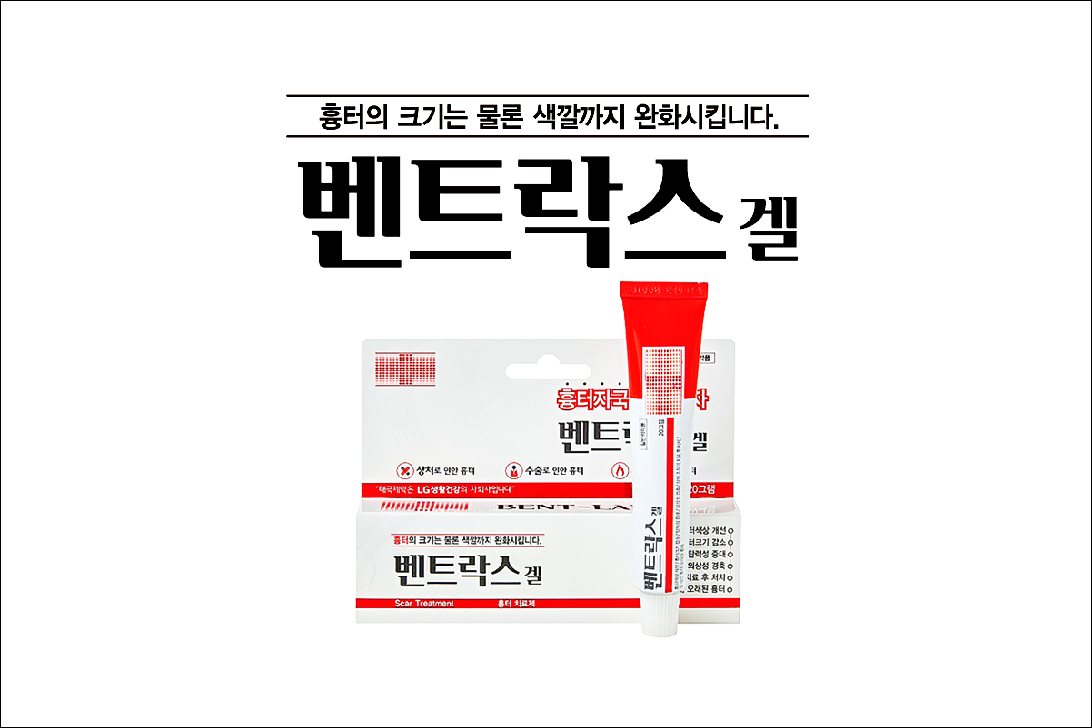 흉터연고 벤트락스겔(Bentrax Gel)에 대해서 알아보겠습니다. 흉터 치료제로 의사의 처방전이 없어도 약국에서 구입이 가능한 일반 의약품입니다. 염증을 억제하고, 피부이상증식 억제효과를 나타내어 각종 흉터 치료에 사용하는 약입니다. 새살이 신속하게 생성되도록 도와주고, 흉터가 생기는 과정에서 콜라겐 섬유 구조를 느슨하게 하여 흉터가 심해지지 않도록 합니다.