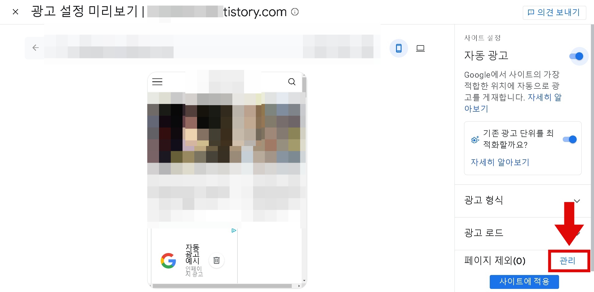 이미 삭제한 페이지나 특정 사이트에서 자동 광고를 제외할 수 있다.