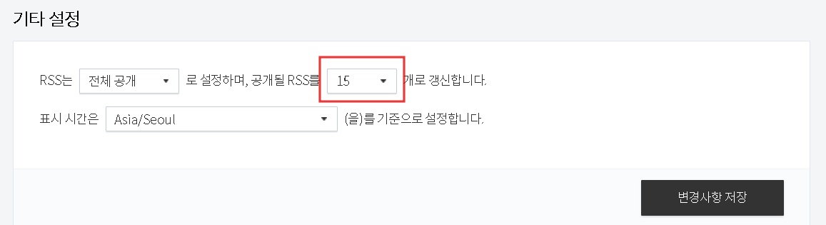 여전히' 'RSS 본문크기를 줄여주세요' '올바른 rss 가 아닙니다.' 라는 경고창이 뜨면 다시 블로그로 돌아와 공개될 RSS 개수를 15개로 줄여줍니다.