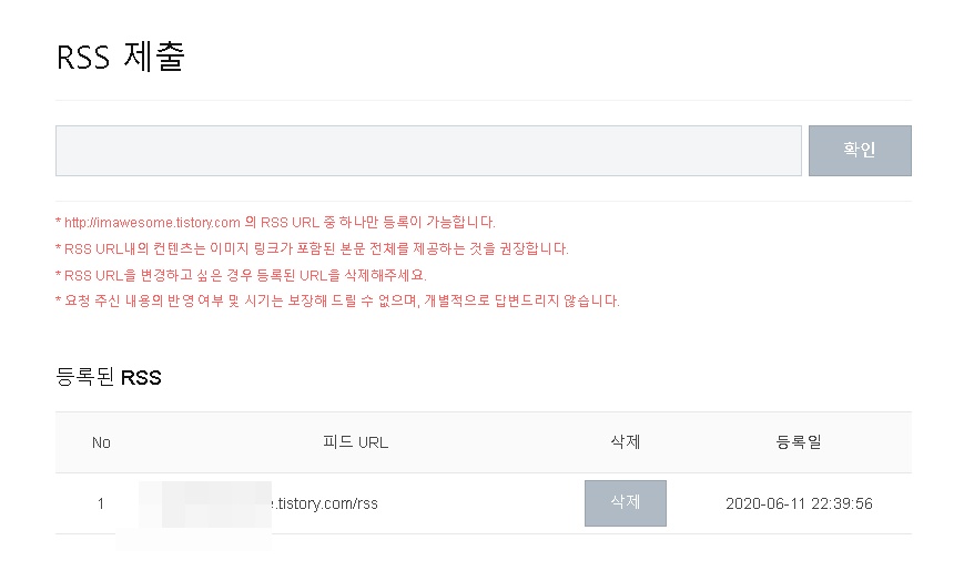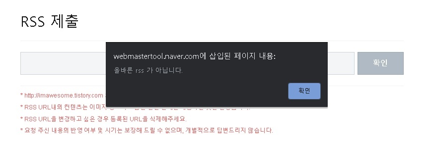 위와 같이 네이버 웹마스터 도구에 RSS를 등록하려고 했는데