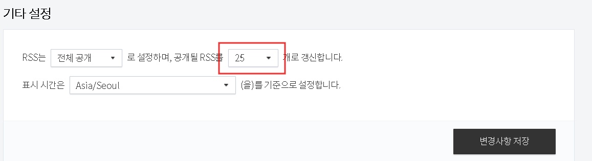 여기서 공개될 RSS 개수를 처음보다 작게 줄여나가며 확인 합니다. 처음에 30개로 설정되어 있었다면 25개로 설정하고 변경사항을 저장한 후 네이버 웹마스터 도구로 돌아와 RSS 등록을 시도해봅니다.