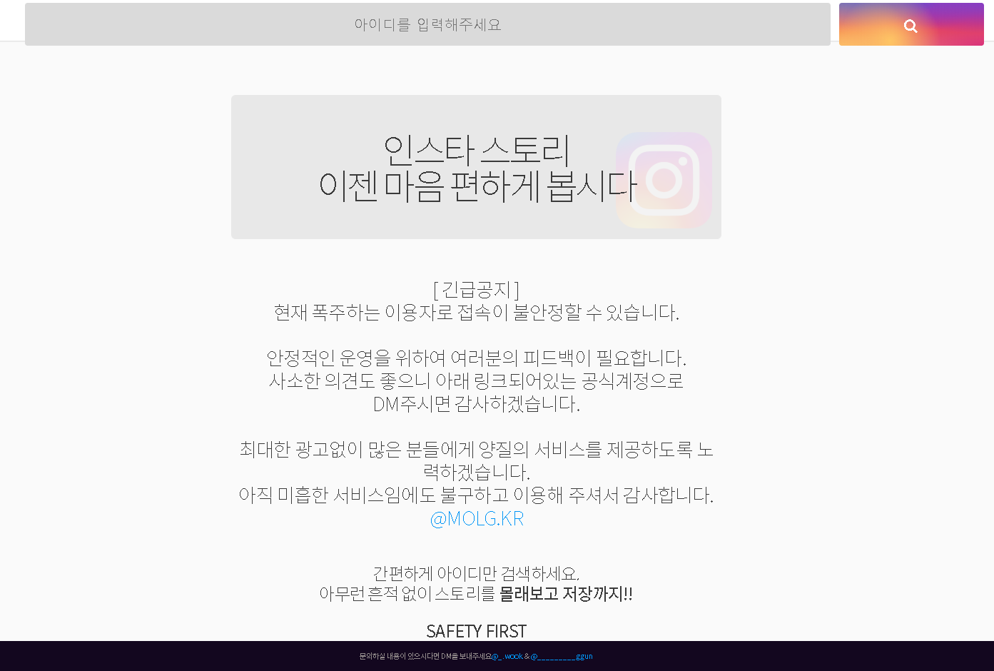 한글로는 몰쥐라고 불리며 인스타 스토리를 사용자 명 입력만으로 인스타 스토리의 사진과 동영상을 다운로드할 수 있습니다. 국내 사용자를 위해 개발된 사이트이기 때문에 당연히 국내 이용자에게 최적화되어 있으며 속도 또한 빠른 편입니다. 사이트 관리자 역시 오류 발생 시 적극적으로 해결하고 있어 국내 이용자들이 아주 많이 인스타 스토리 검색과 다운로드에 이용하고 있는 사이트입니다.