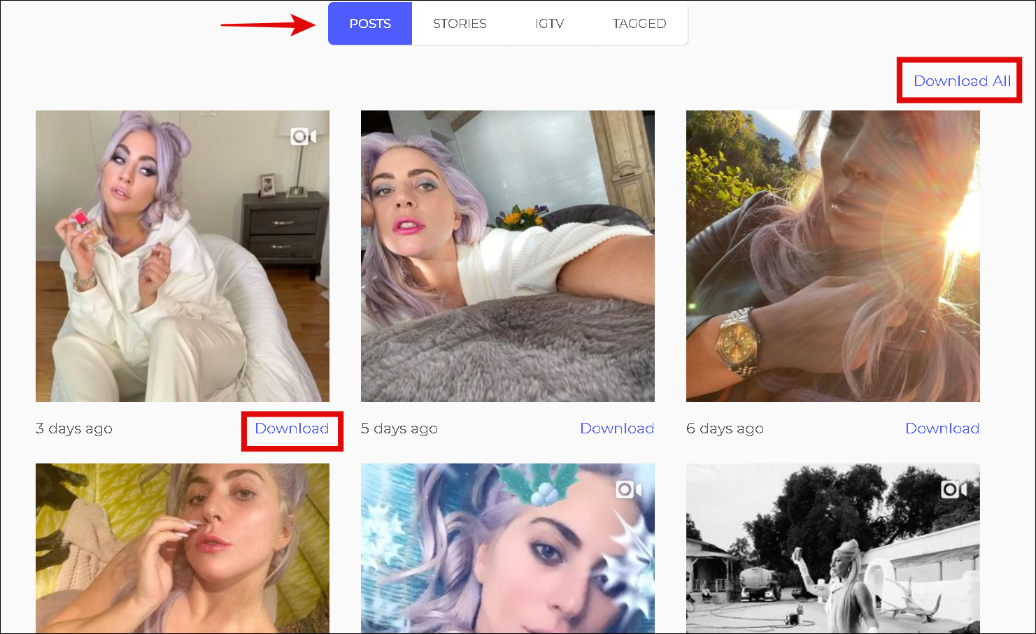 포스트, 스토리, IGTV, 태그 등을 클릭해 원하는 사진, 영상을 볼 수 있으며 각 게시물에 'Download'라는 버튼이 있는 것을 확인할 수 있습니다. 'Download'를 클릭하면 바로 다운로드할 수 있습니다.