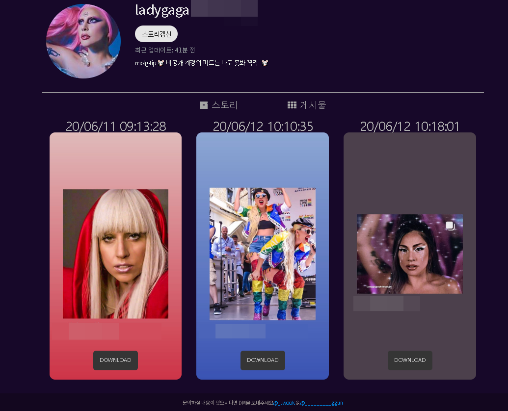인스타 계정의 사용자 계정(username)을 붙여 넣고 검색을 하면 최근 올라온 인스타 스토리의 스토리를 볼 수 있습니다.